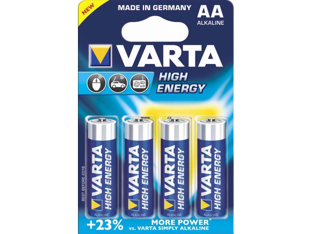 Alkalická tužková 1,5V baterie LR6/AA Varta High Energy s novou technologií, skladovatelností 10 let.