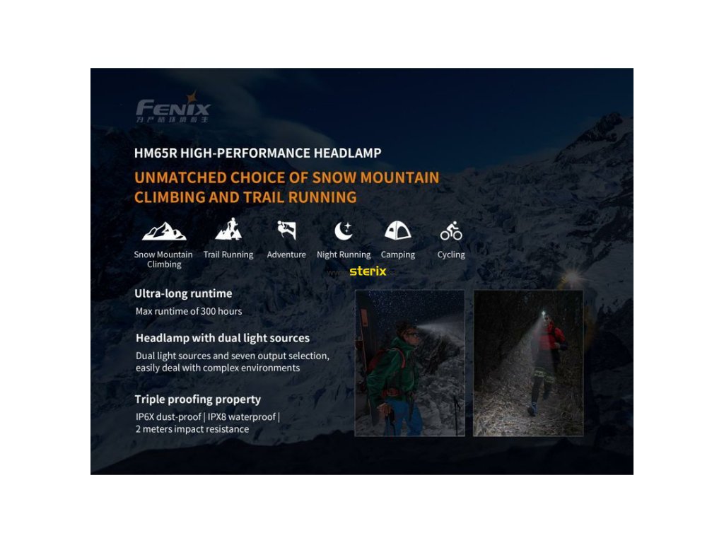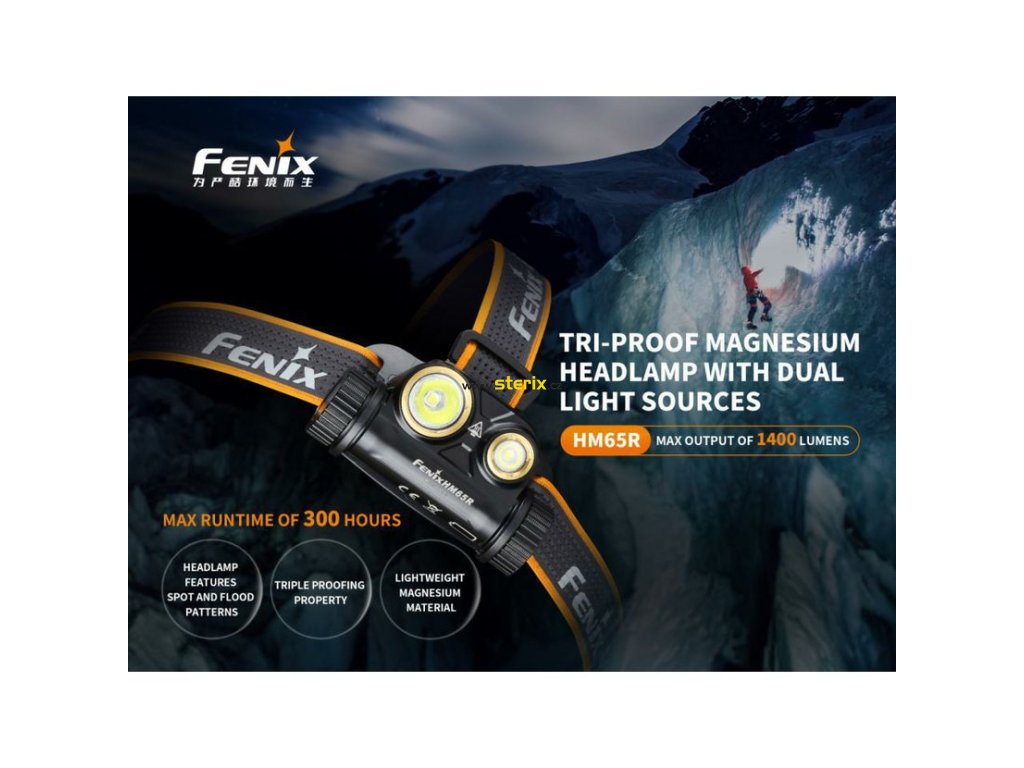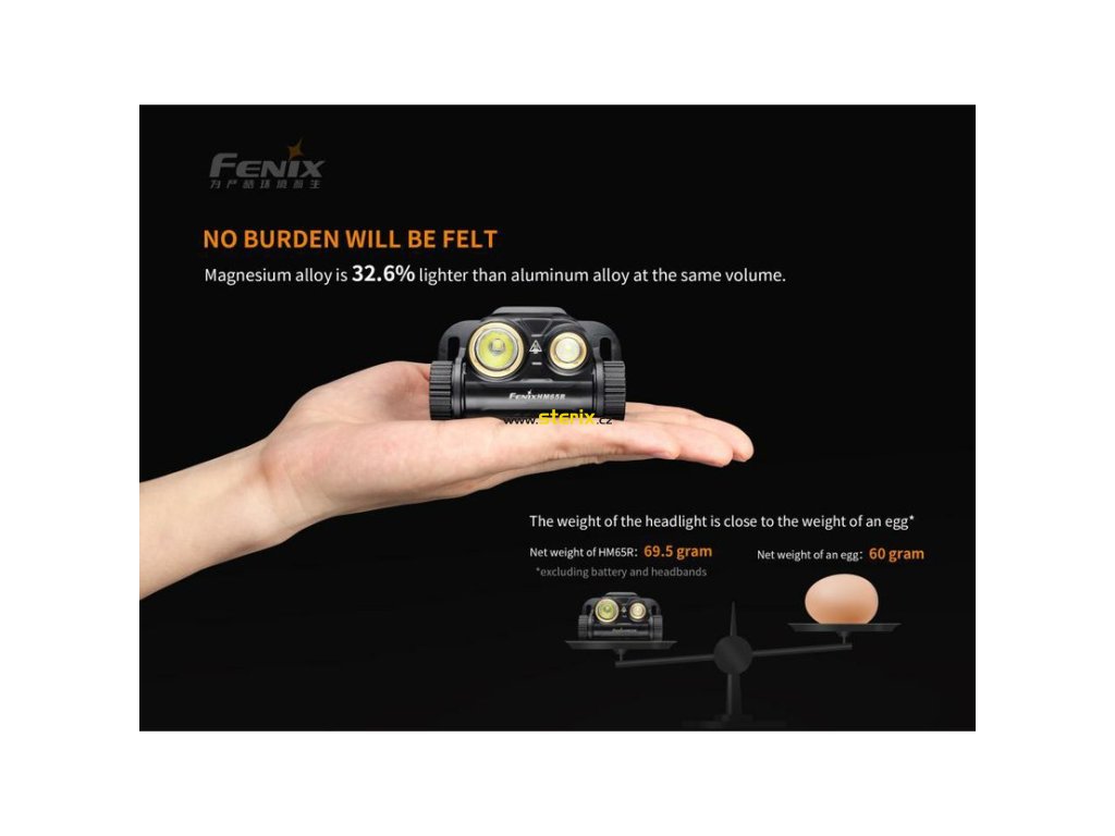 Nabíjecí čelovka Fenix HM65R se vyznačuje konstrukcí z lehké magnéziové slitiny, vysokou odolností proti vodě i pádu, unikátní konstrukcí se dvěma reflektory a celkovým výkonem až 1400 lumenů.