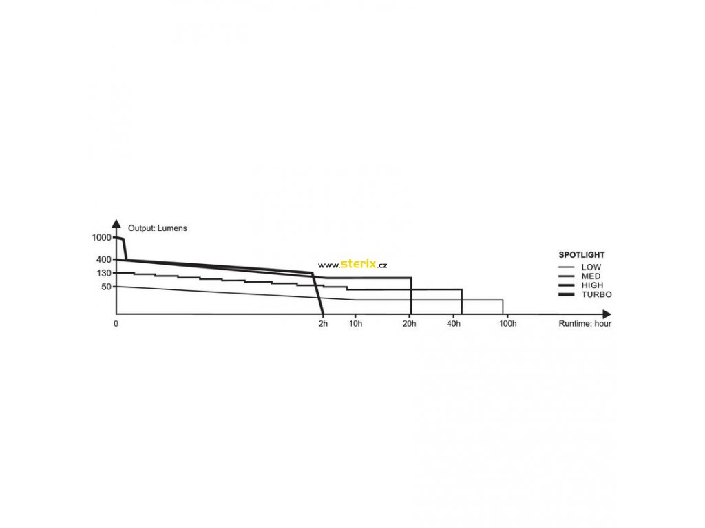 - Široký reflektor: 400 lumenů (21 hodin) -> 130 lumenů (50 hodin) -> 8 lumenů (300 hodin).