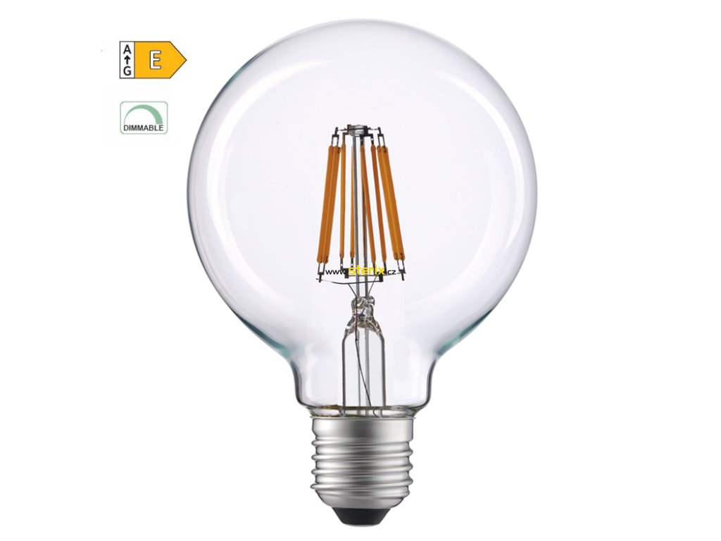 LED Retro Globe dekorativní žárovka 10W čirá G125 ve tvaru koule s LED Filament čipy, která nahrazuje 100W žárovku s paticí E27.