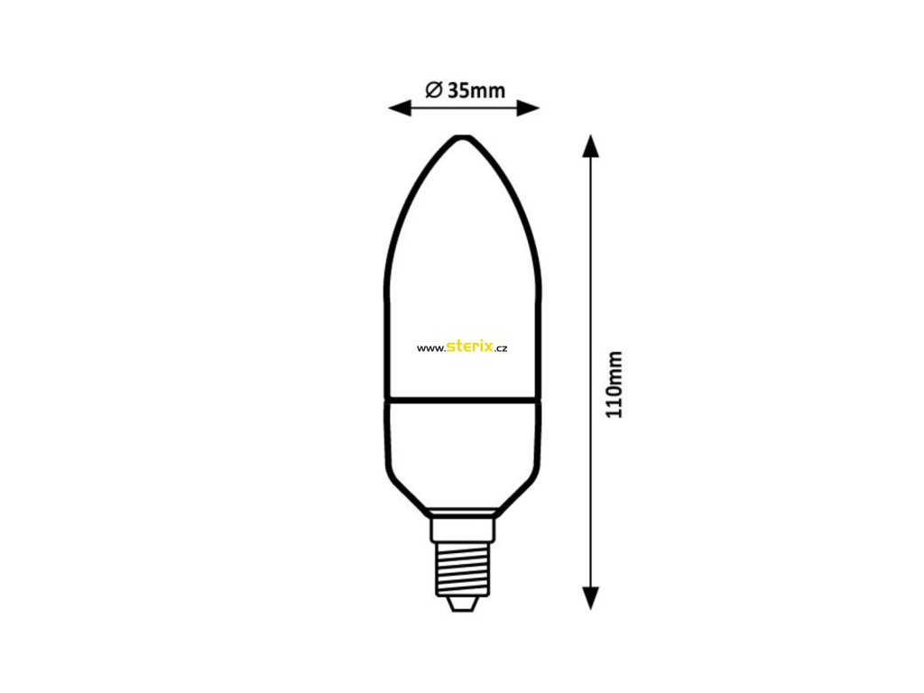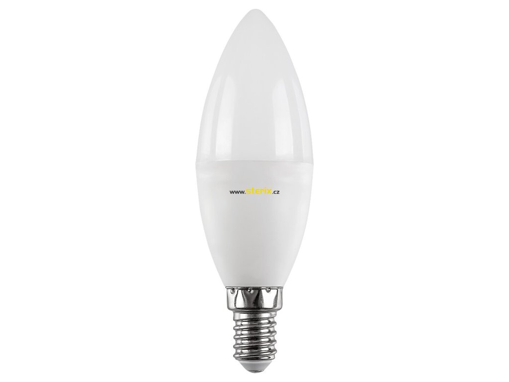 - Moderní a úsporná matná plastová SMD LED svíčková žárovka tvar C35 s příkonem 9W a paticí E14