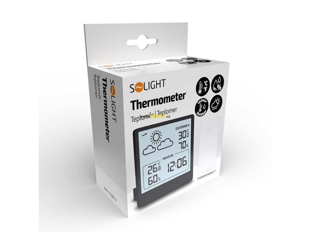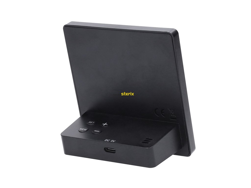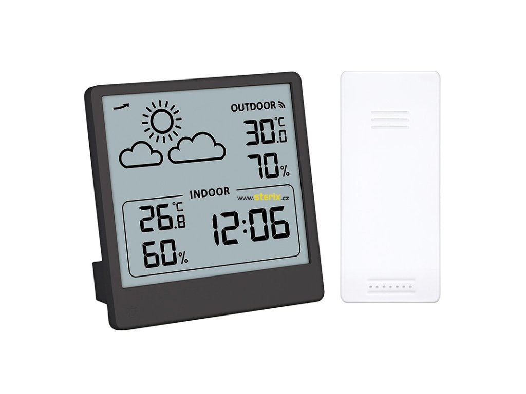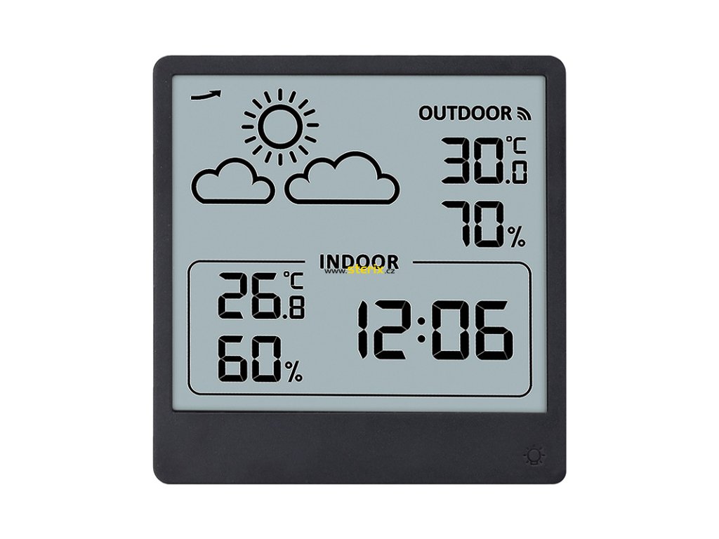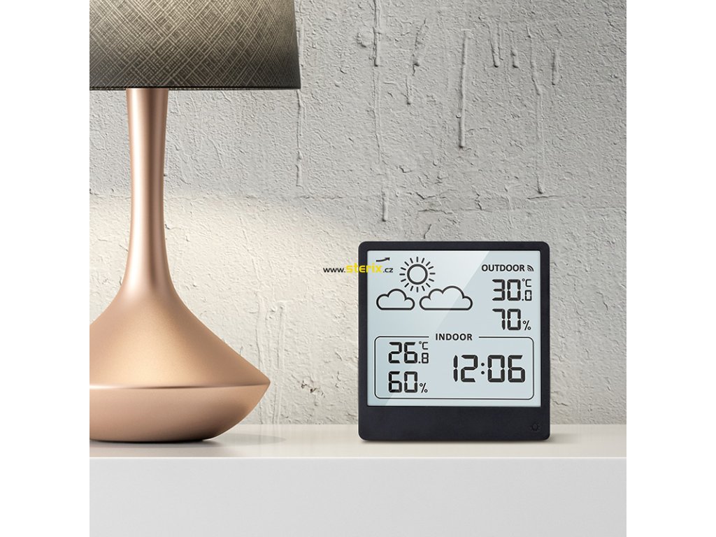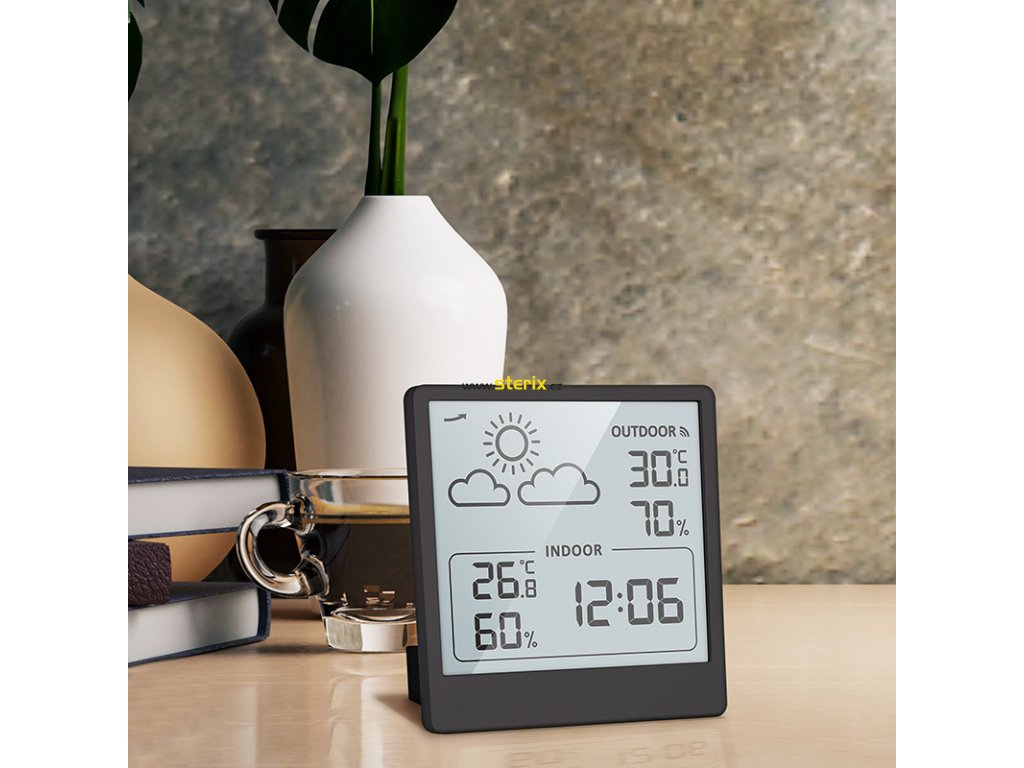 Meteorologická stanice s displejem pro zobrazení času ve formátu 12/24 hodin. Měření vnitřní teploty od -9,9°C do +50°C a venkovní teploty od -40°C do +70°C. Měření vlhkosti (20% až 95%) pro vnitřní i venkovní prostředí. Ukládání maximálních a minimálních hodnot teploty a vlhkosti, zobrazení trendu změny tlaku a předpověď počasí na základě změn tlaku. Možnost volby jednotek teploty °C/°F. Napájení: hlavní jednotka 2× AAA baterie nebo DC5V / 2A, senzor 2× AAA baterie (není součástí balení). Barva: černá.