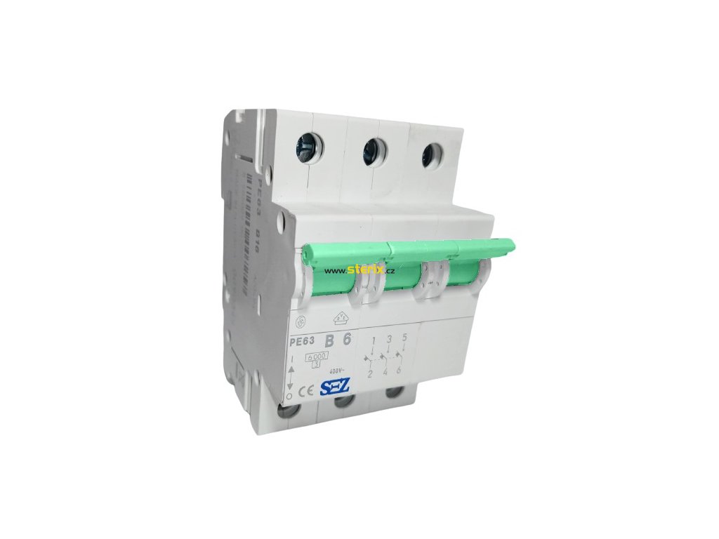 Třífázový jistič SEZ PE 63-B 6A na DIN lištu je třípólový jistič s charakteristikou zátěže B s maximálním proudem 6 A a zkratovou schopností 6 kA.