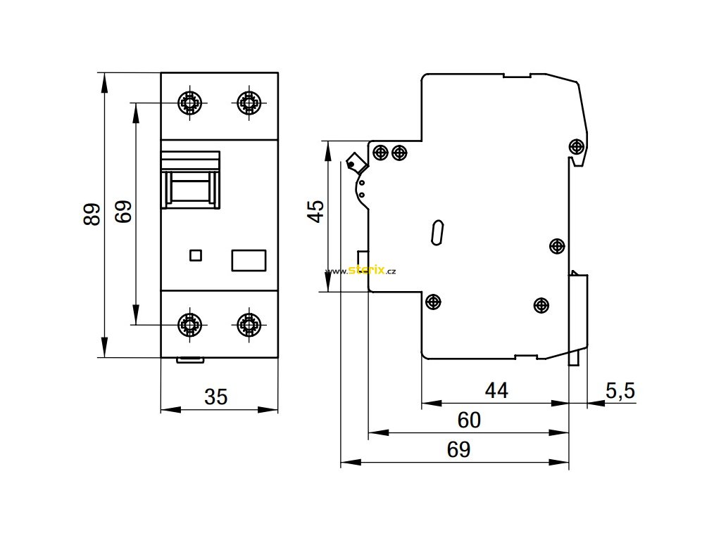 - Proudový chránič 2 póly, 16 A, 30 mA, 10 kA SEZ KR PFB2 16/0,03