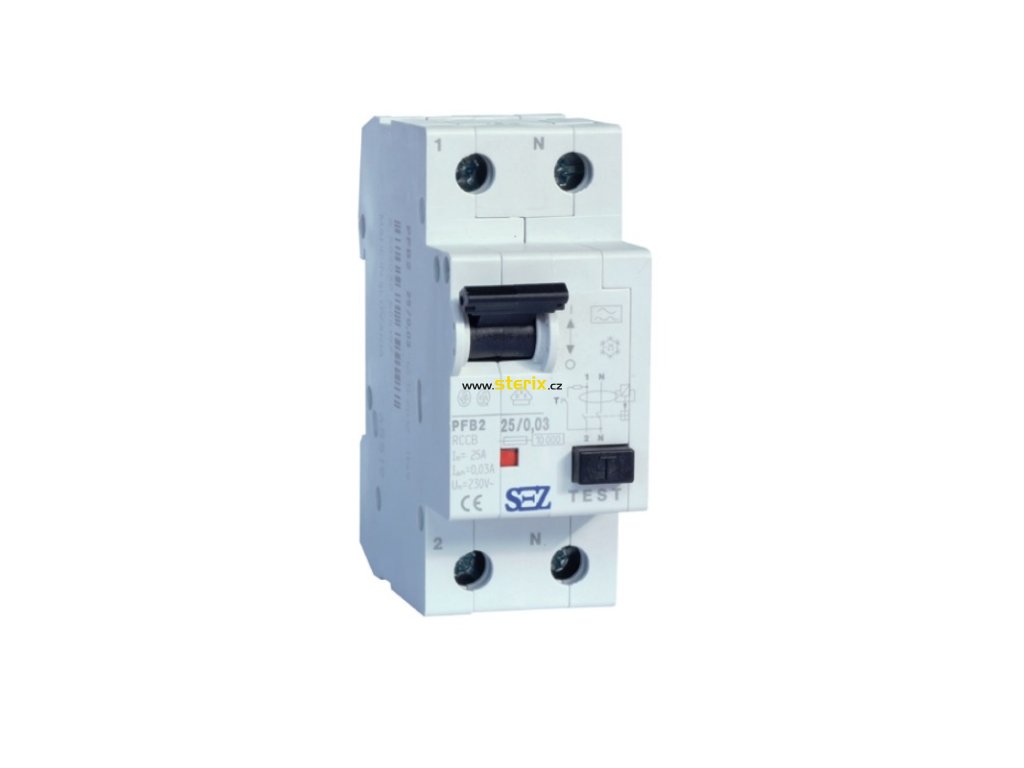 Proudový chránič SEZ PFE 40/2/0,03 na DIN lištu je dvoupólový proudový chránič s maximálním proudem 40 A a jmenovitým reziduálním proudem 0,03 A a zkratovým proudem 6 kA.