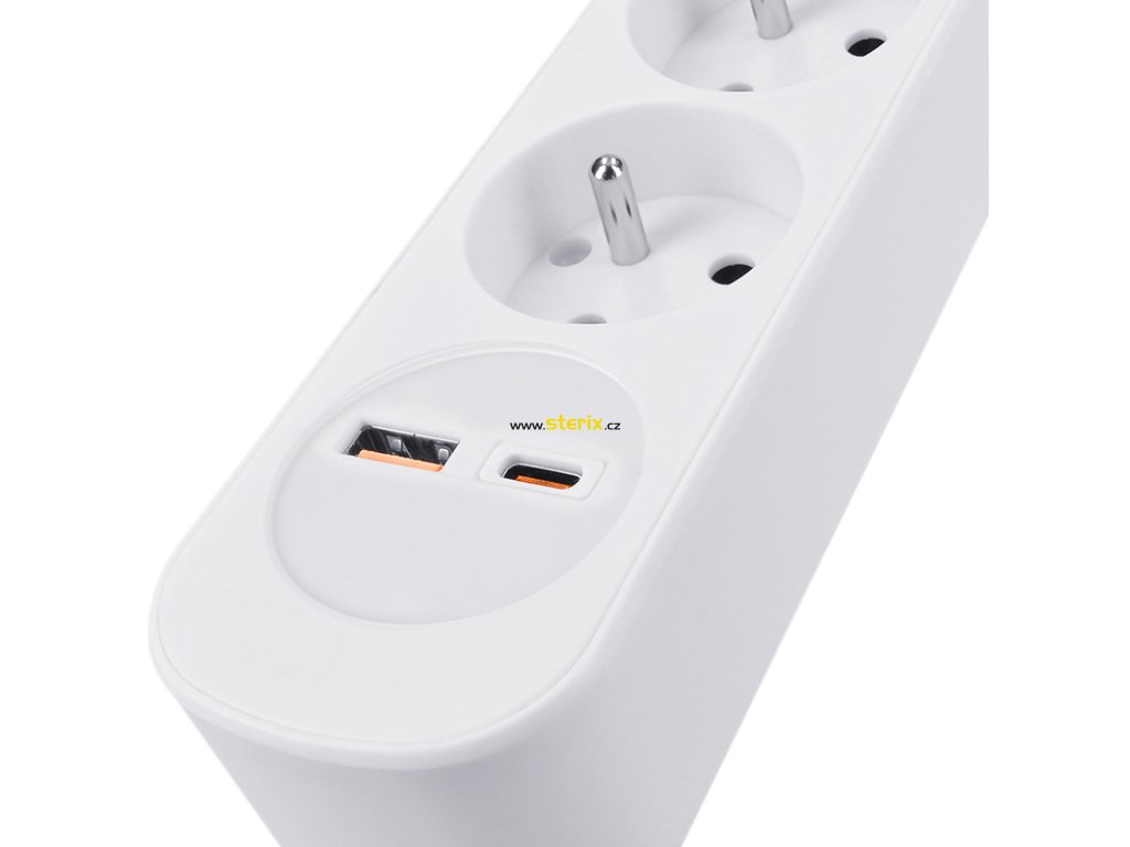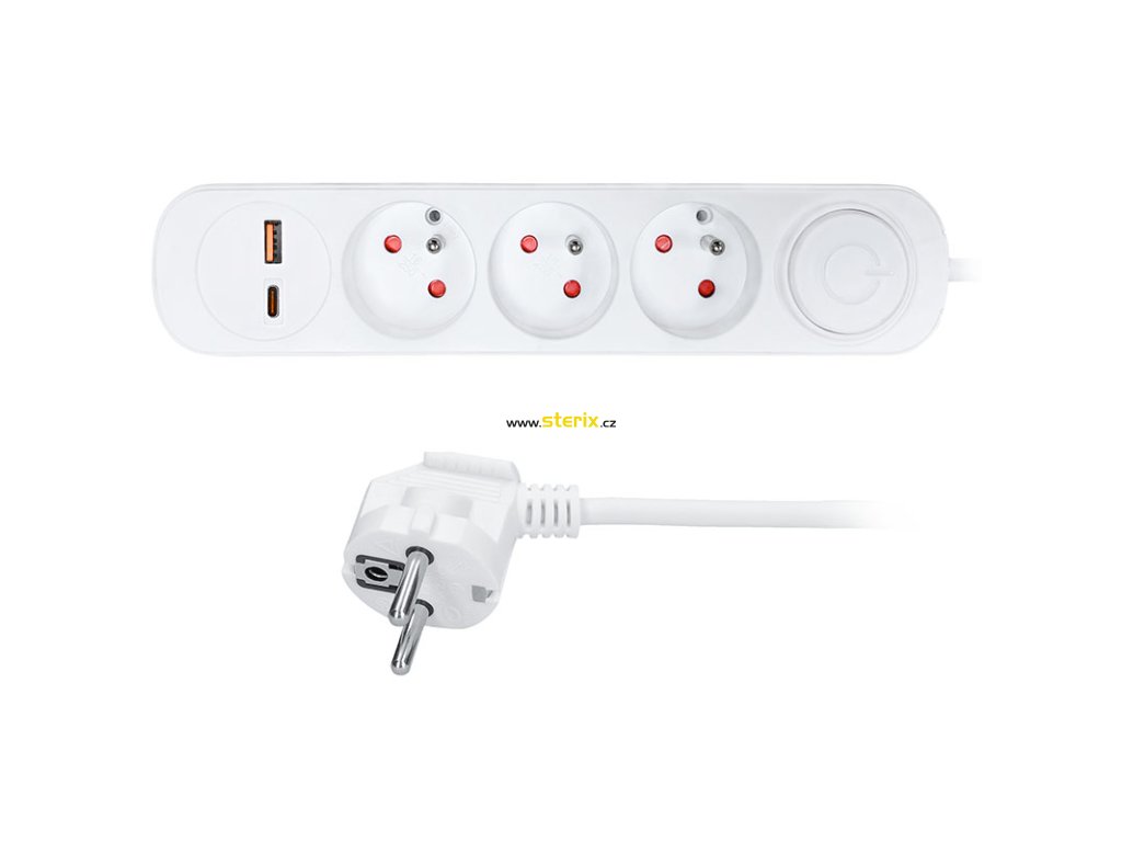 Prodlužovací přívod 3 zásuvky, USB A+C 20W PD, 2m, 3 x 1mm2, bílý, vypínač