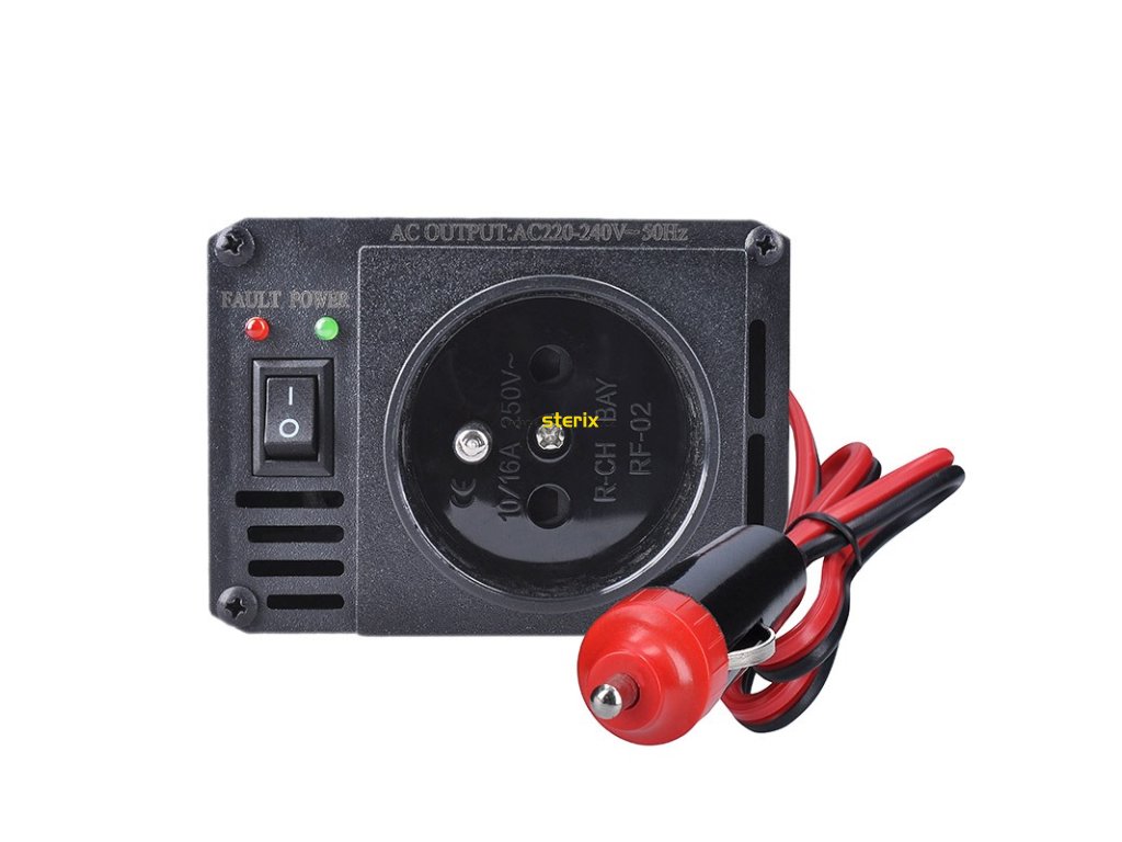 Menič napätia (invertor) 12V DC -> 230V AC, maximálne zaťaženie 200W, USB 500mA, kovový čierny.