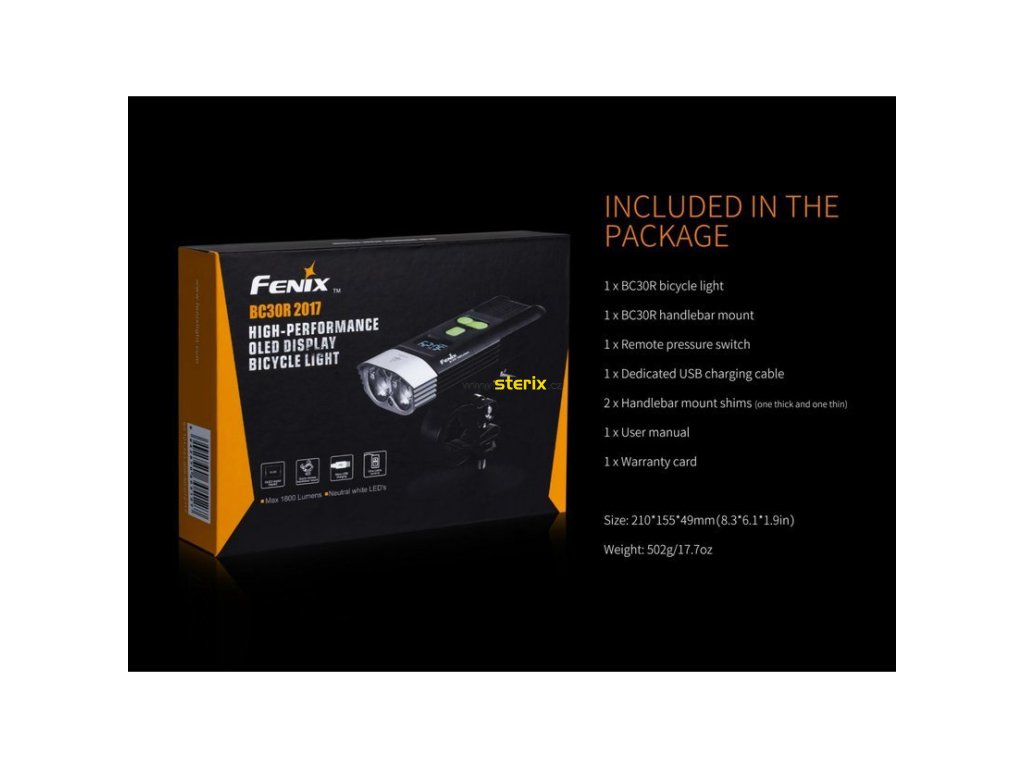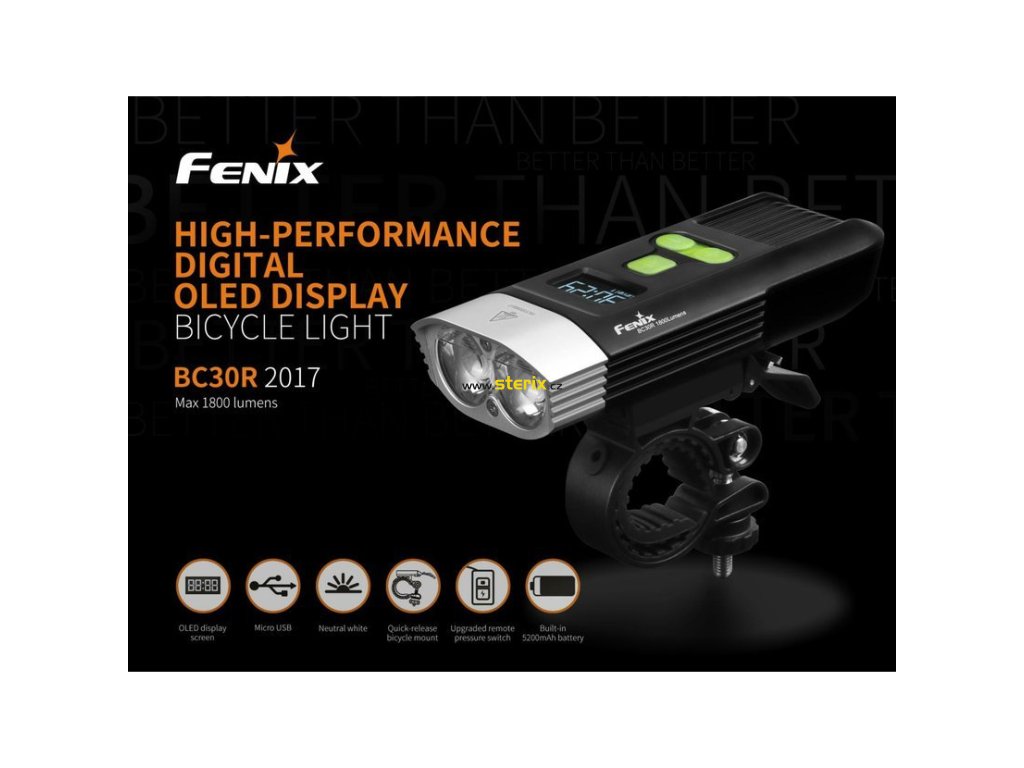 Druhá generácia nabíjacej baterky Fenix BC30R poskytuje až 1800 lúmenov (ANSI) a dosvit až 161 metrov. Napájanie zabezpečuje interná lítium-iónová batéria s kapacitou 5200 mAh / 3,7 V, ktorá sa nabíja prostredníctvom konektora micro USB priamo v baterke. Zdrojom svetla sú dve moderné diódy LED Cree XM-L2 U2 s teplejším odtieňom svetla (neutrálna biela). Výhodou tohto odtieňa svetla je prirodzenejšie a kontrastnejšie podanie farieb v teréne. Svietidlo využíva osvedčenú technológiu Dual Distance Beam System. Hlavný svetelný kužeľ je vytvorený špeciálne navrhnutou optikou a svieti do diaľky, zatiaľ čo sekundárny široký kužeľ lúčov dopĺňa optický člen, ktorý je v hornej časti tvarovaný tak, aby sa svetlo smerujúce nahor lámalo k zemi. Tým sa vytvorí kužeľ, ktorý nepretržite osvetľuje celý priestor pred bicyklom - dokonca aj na miestach, ktoré bežné svetlá na bicykli nepokryjú.