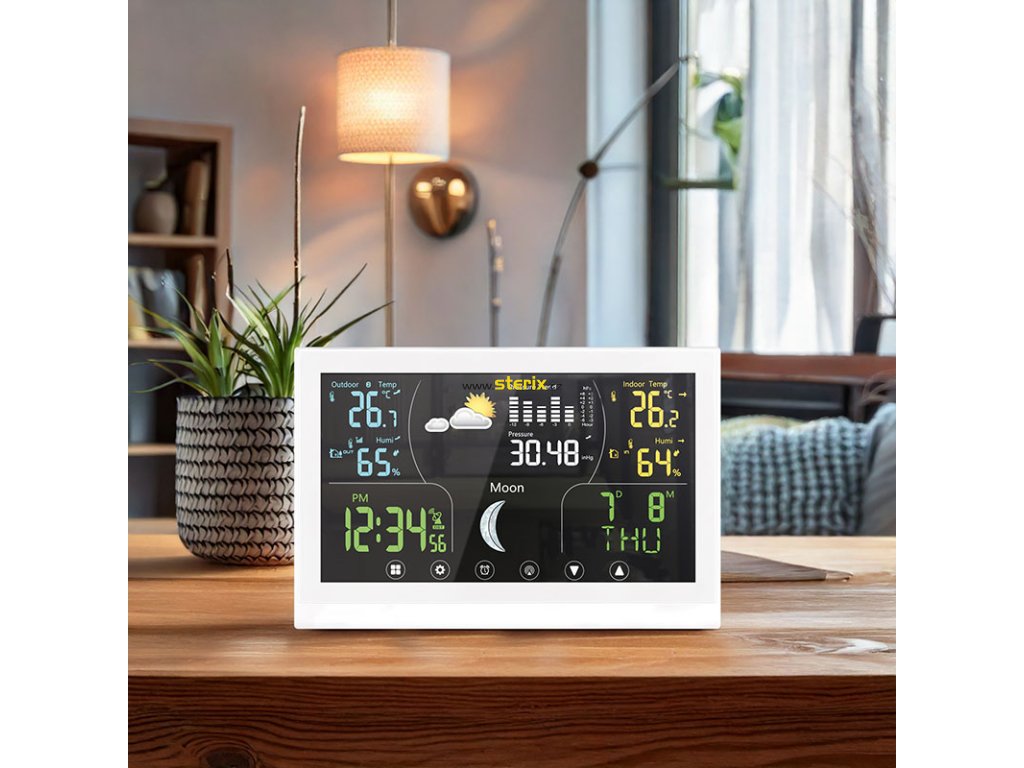 Táto meteostanica ponúka farebný VA displej s dotykovým ovládaním s veľkosťou 168 × 93 mm, ktorý zaisťuje vynikajúcu čitateľnosť a intuitívne ovládanie. Vďaka možnosti trvalého podsvietenia je zobrazenie prehľadné aj v tme. Displej poskytuje širokú škálu informácií, vrátane aktuálnej teploty (vnútorná od -10 °C do +50 °C, vonkajšia od -50 °C do +70 °C), relatívnej vlhkosti (1 % až 99 % RH), atmosférického tlaku a predpovede počasia. Okrem toho zobrazuje fázy Mesiaca, kalendár, dátum a hodiny riadené DCF signálom, čo zaisťuje vždy presný čas. Stanica umožňuje záznam minimálnych a maximálnych hodnôt, nastavenie teplotnej výstrahy, výber jednotiek teploty (°C/°F) a dokonca korekciu nadmorskej výšky pre presnejšie meranie tlaku. Je vybavená funkciou budíka s možnosťou opakovaného budenia, čo z nej robí praktického pomocníka nielen na sledovanie počasia, ale aj na každodenné použitie. Bezdrôtový snímač s dosahom až 100 m (súčasť balenia) umožňuje presné meranie vonkajších podmienok a je možné pripojiť až tri snímače súčasne. Napájanie hlavnej jednotky je možné buď adaptérom (5 V DC/300 mA), alebo tromi AAA batériami, zatiaľ čo snímač využíva dve AAA batérie. Vďaka kompaktným rozmerom hlavnej jednotky (17 × 192 × 127 mm) a elegantnému čiernemu prevedeniu sa hodí do akéhokoľvek interiéru a poskytuje moderný a štýlový doplnok domácnosti.