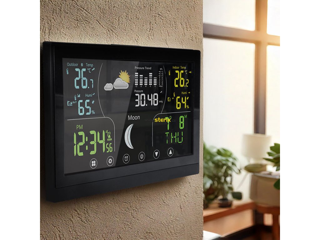 Táto meteostanica ponúka farebný VA displej s dotykovým ovládaním s veľkosťou 168 × 93 mm, ktorý zaisťuje vynikajúcu čitateľnosť a intuitívne ovládanie. Vďaka možnosti trvalého podsvietenia je zobrazenie prehľadné aj v tme. Displej poskytuje širokú škálu informácií, vrátane aktuálnej teploty (vnútorná od -10 °C do +50 °C, vonkajšia od -50 °C do +70 °C), relatívnej vlhkosti (1 % až 99 % RH), atmosférického tlaku a predpovede počasia. Okrem toho zobrazuje fázy Mesiaca, kalendár, dátum a hodiny riadené DCF signálom, čo zaisťuje vždy presný čas. Stanica umožňuje záznam minimálnych a maximálnych hodnôt, nastavenie teplotnej výstrahy, výber jednotiek teploty (°C/°F) a dokonca korekciu nadmorskej výšky pre presnejšie meranie tlaku. Je vybavená funkciou budíka s možnosťou opakovaného budenia, čo z nej robí praktického pomocníka nielen na sledovanie počasia, ale aj na každodenné použitie. Bezdrôtový snímač s dosahom až 100 m (súčasť balenia) umožňuje presné meranie vonkajších podmienok a je možné pripojiť až tri snímače súčasne. Napájanie hlavnej jednotky je možné buď adaptérom (5 V DC/300 mA), alebo tromi AAA batériami, zatiaľ čo snímač využíva dve AAA batérie. Vďaka kompaktným rozmerom hlavnej jednotky (17 × 192 × 127 mm) a elegantnému čiernemu prevedeniu sa hodí do akéhokoľvek interiéru a poskytuje moderný a štýlový doplnok domácnosti.