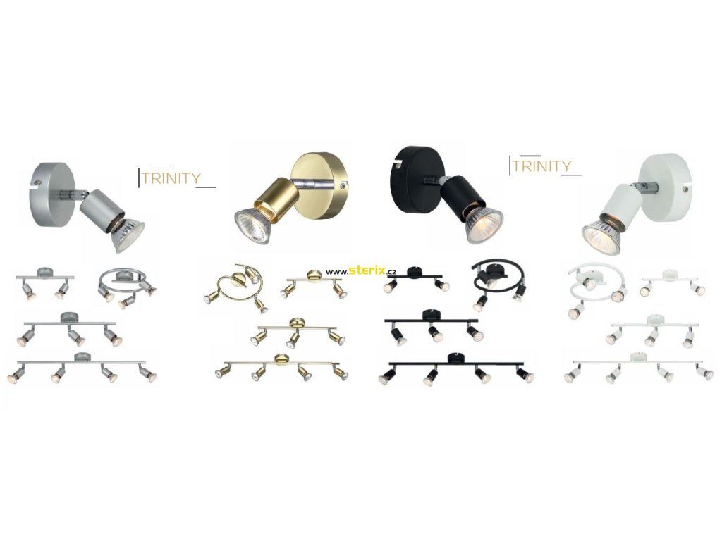 Závesné bodové stropné alebo nástenné svietidlo TRINITY, kovový materiál, chrómová a zlatá farba, výkon halogénovej žiarovky max. 50 W, pätica pre objímku GU10, IP20.