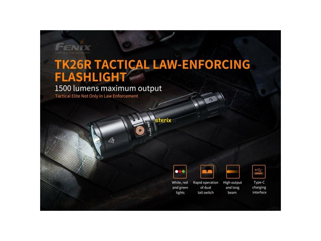 Taktická dobíjacia baterka Fenix TK26R s bielou, červenou a zelenou LED diódou.