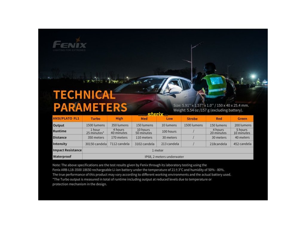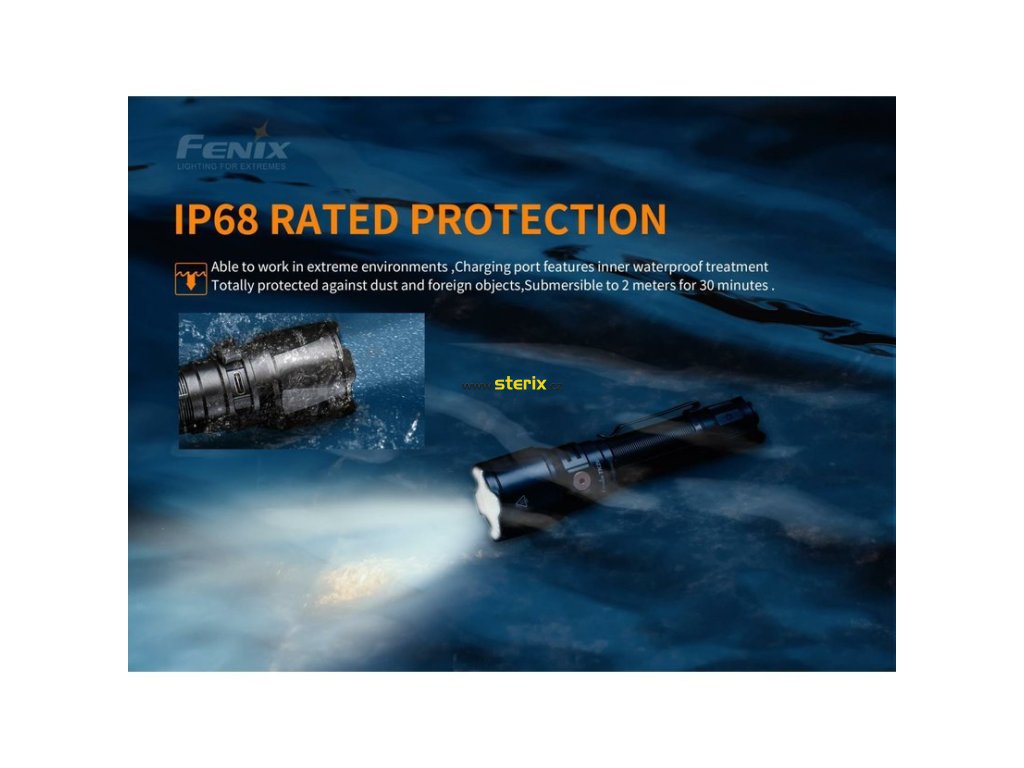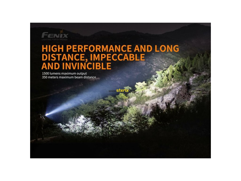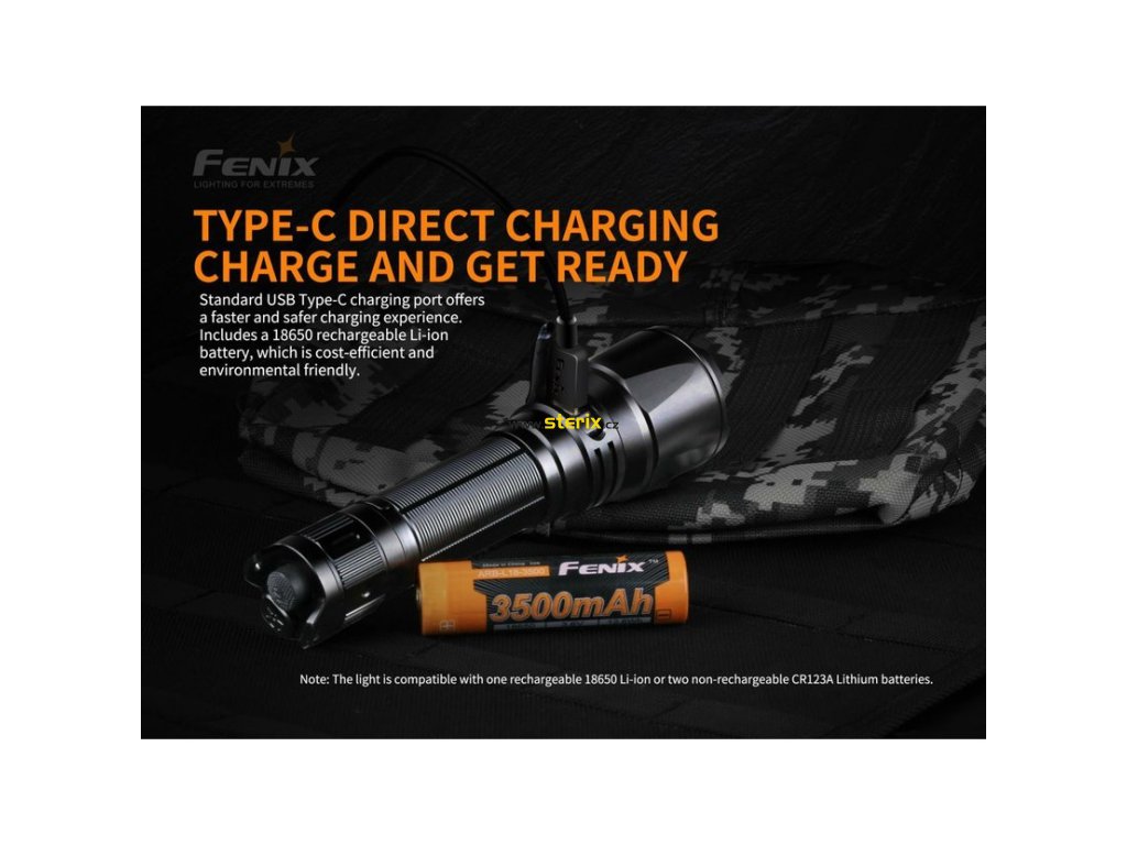 - Svietidlo sa dodáva so šnúrkou na zápästie, puzdrom na opasok, náhradným o-krúžkom, nabíjacím káblom USB-C a batériou Fenix Li-ion 18650 3500 mAh.