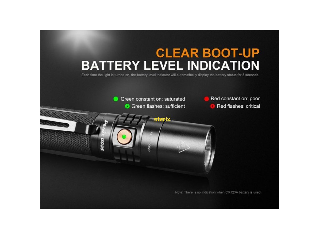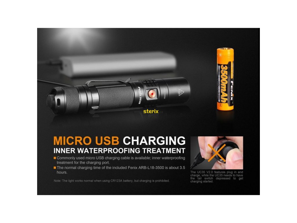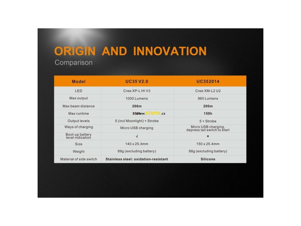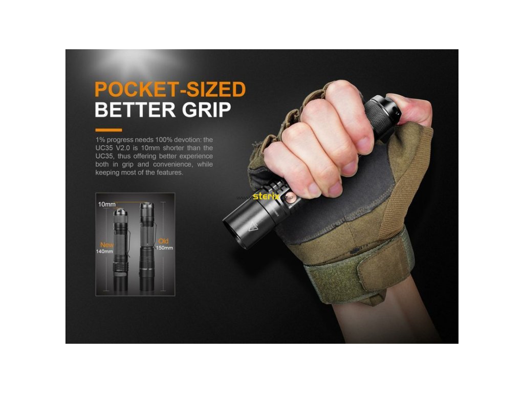 Druhá generácia nabíjacej taktickej baterky Fenix UC35 V2.0 je vybavená najnovšou LED Cree XP-L HI V3 a poskytuje svietivosť až 1000 lúmenov (ANSI) a dosvit až 266 metrov.
