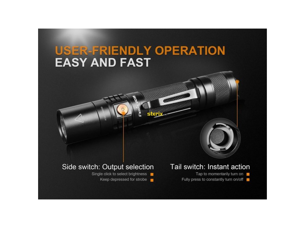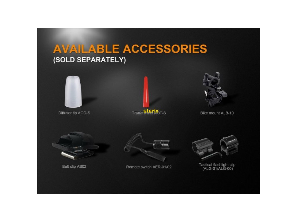- Svietidlo je možné namontovať aj na dlhú zbraň pomocou držiaka na pištoľovú lištu Fenix ALG-01, držiaka na pištoľovú lištu Fenix ALG-00, magnetického držiaka