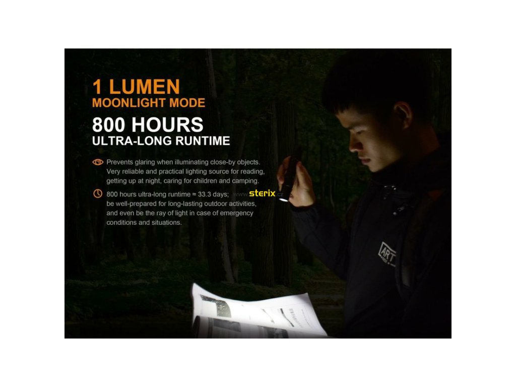 - Šesť režimov svietenia: turbo 1000 lúmenov (2,25 hodiny) -> 350 lúmenov (4,1 hodiny) -> 150 lúmenov (10,6 hodiny) -> 50 lúmenov (28,1 hodiny) -> 1 lúmen (800 hodín) - stroboskop 1000 lúmenov (variabilná frekvencia stroboskopu).