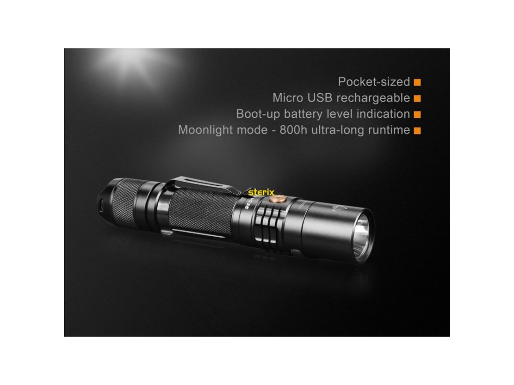 - Svietidlo sa dodáva so šnúrkou na zápästie, puzdrom na opasok, batériou Fenix 18650 s kapacitou 3500 mAh, káblom USB a náhradnými o-krúžkami.