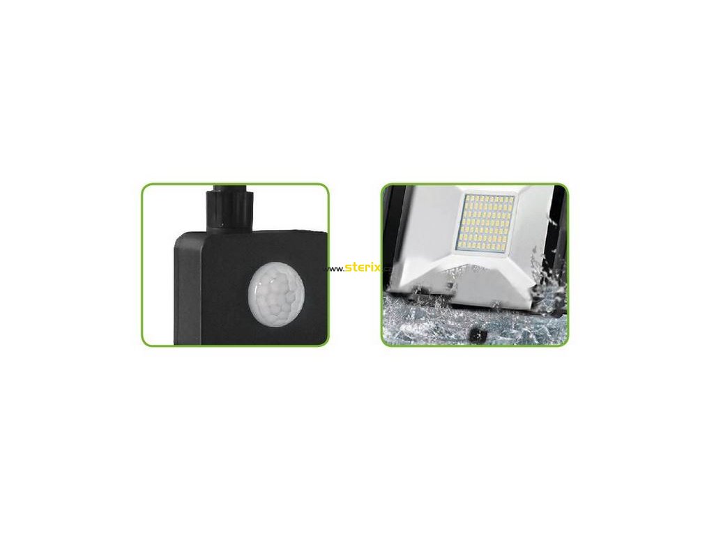 Biely vonkajší LED reflektor 50W X s LED čipmi SMD LM80 a pohybovým senzorom.
