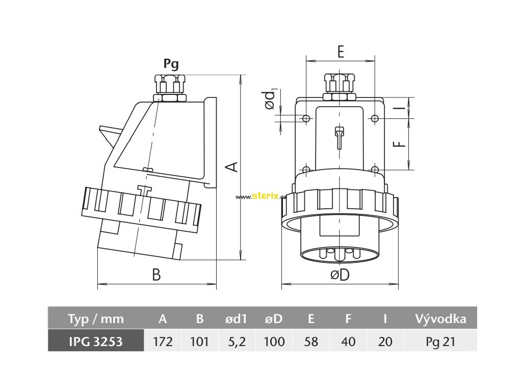 Priemyselná nástenná prívodka (vidlica) SEZ IPG 3253 je 5-pólová nástenná prívodka pre menovité napätie 400 V s prúdom 32 A a vonkajším krytím IP 67.