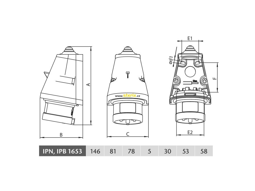 Priemyselná nástenná prívodka (vidlica) SEZ IPB 1653 je 5-pólová bezskrutková nástenná prívodka pre menovité napätie 400 V s prúdom 16 A a krytím IP 44.