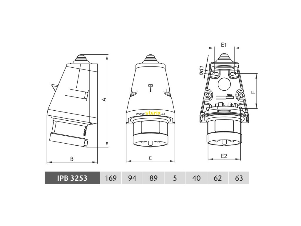 Priemyselná nástenná prívodka (vidlica) SEZ IPB 3253 je 5-pólová bezskrutková nástenná prívodka pre menovité napätie 400 V s prúdom 32 A a krytím IP 44.