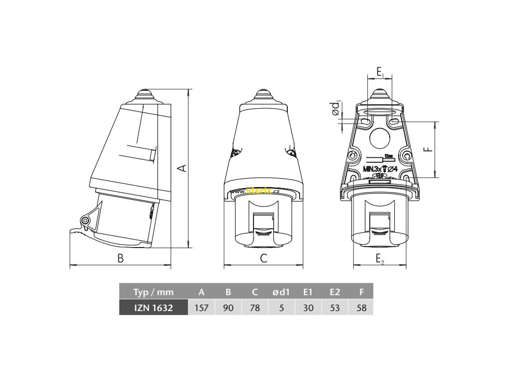 Priemyselná nástenná zásuvka SEZ IZN 1632 je 3-pólová nástenná zásuvka pre menovité napätie 230 V s prúdom 16 A a krytím IP 44.