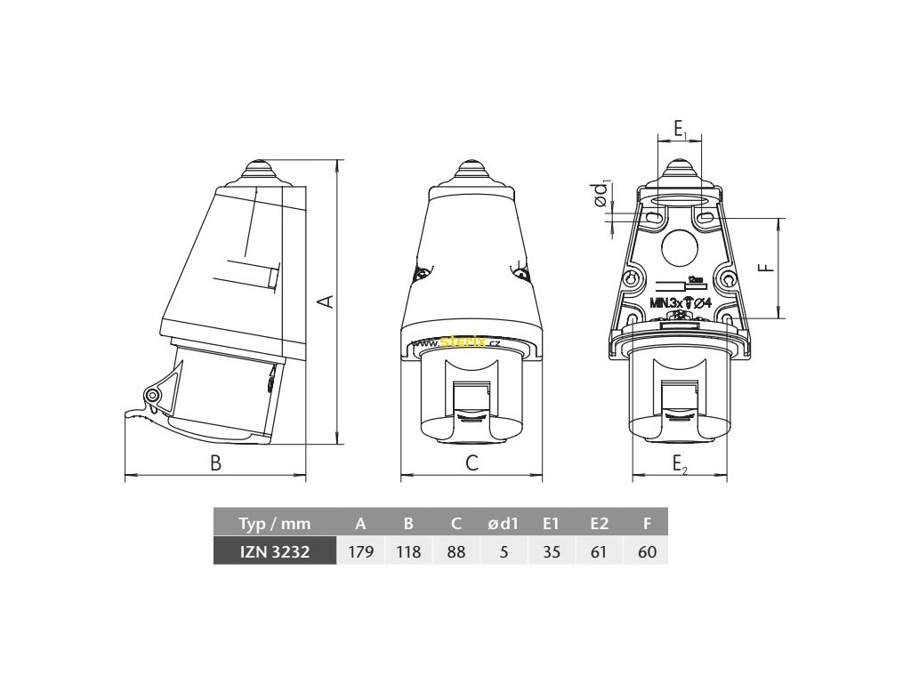 Priemyselná nástenná zásuvka SEZ IZN 3232 je 3-pólová nástenná zásuvka pre menovité napätie 230 V s prúdom 32 A a krytím IP 44.