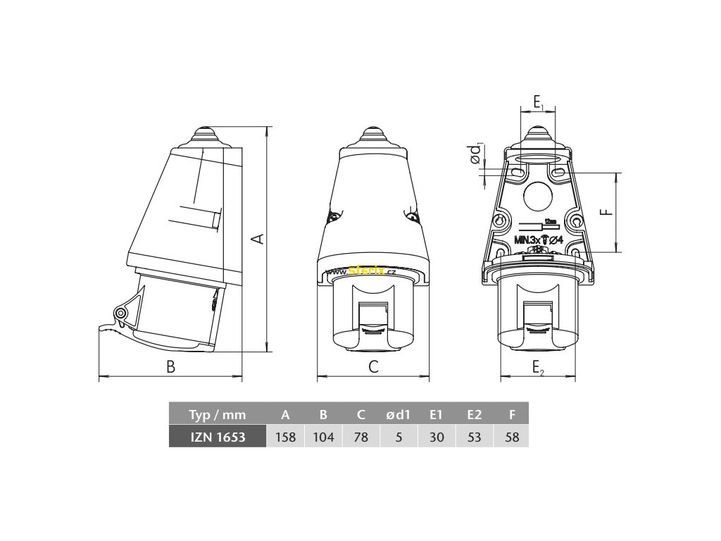 Priemyselná nástenná zásuvka SEZ IZN 1653 je 5-pólová nástenná zásuvka pre menovité napätie 400 V s prúdom 16 A a krytím IP 44.