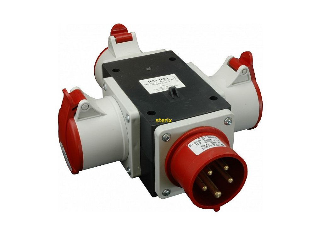 Roztrojka bez istenia, vstup IRRN 1653, výstup 3x IERN 1653, IP44 je 5-pólový adaptér menovitého napätia 400 V pre trojnásobné rozdelenie výstupu 16 A s krytím IP 44 a vysokou pevnosťou a odolnosťou. POUŽITIE: v interiéri aj exteriéri v obytných budovách a domoch na staveniskách, priemyselných rozvodoch, a pod.