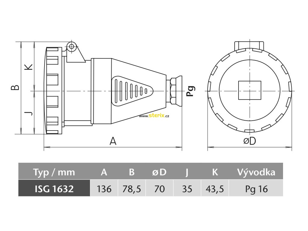 Priemyselná káblová spojovacia zásuvka SEZ ISG 1632 je 3-pólová rovná spojovacia zásuvka pre menovité napätie 230 V s prúdom 16 A a vonkajším krytím IP 67.
