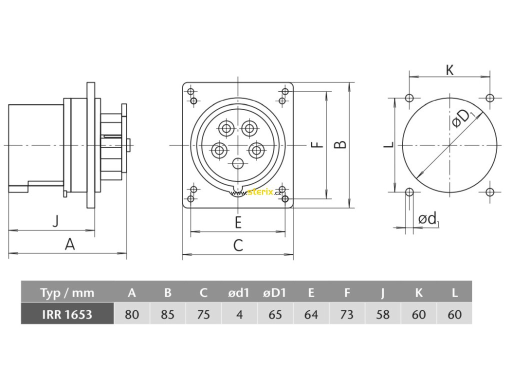 Priemyselná vstavaná prívodka (vidlica) SEZ IRR 1653 je 5-pólová rovná vstavaná prívodka pre menovité napätie 400 V s prúdom 16 A a vonkajším krytím IP 44.