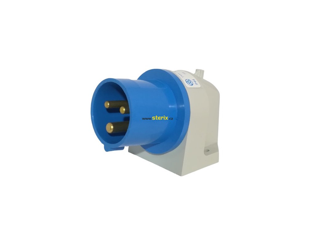 Priemyselná vstavaná prívodka (vidlica) SEZ IR 1632 je 3-pólová uhlová prívodka pre menovité napätie 230 V s prúdom 16 A s krytím IP 44.