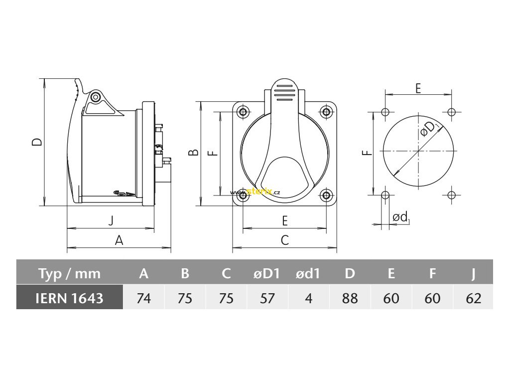 Priemyselná zásuvka vstavaná SEZ IERN 1643 je 4-pólová rovná zásuvka pre menovité napätie 400 V s prúdom 16 A a vonkajším krytím IP 54.