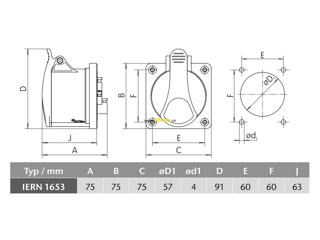 Priemyselná zásuvka vstavaná SEZ IERN 1653 je 5-pólová rovná zásuvka pre menovité napätie 400 V s prúdom 16 A a vonkajším krytím IP 54.