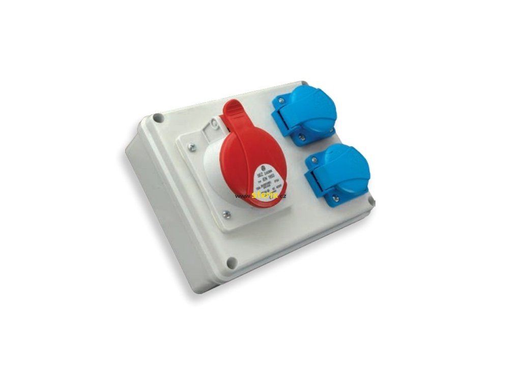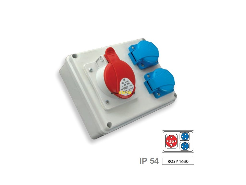 Vonkajšia neistená minizásuvková kombinácia ROS 1630 Praktik-IP54, s 1 x zásuvkou 1643 4-pól a 2 x domovou zásuvkou 230V je vhodná na pripojenie trojfázových aj jednofázových elektrických spotrebičov, vonkajšie krytie IP 54.