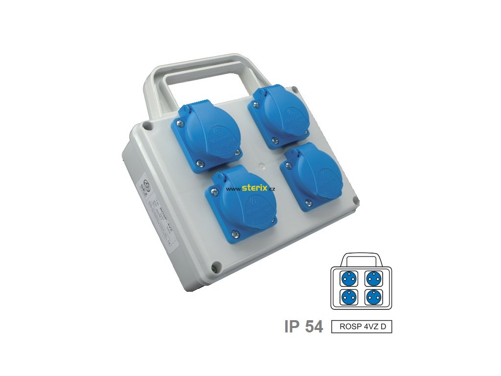 Vonkajšia minizásuvková kombinácia ROSP 4VZD Praktik-IP54 s držiakom, 4 x domovou zásuvkou 230V/16A je vhodná na pripojenie jednofázových elektrických spotrebičov.