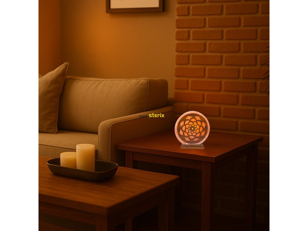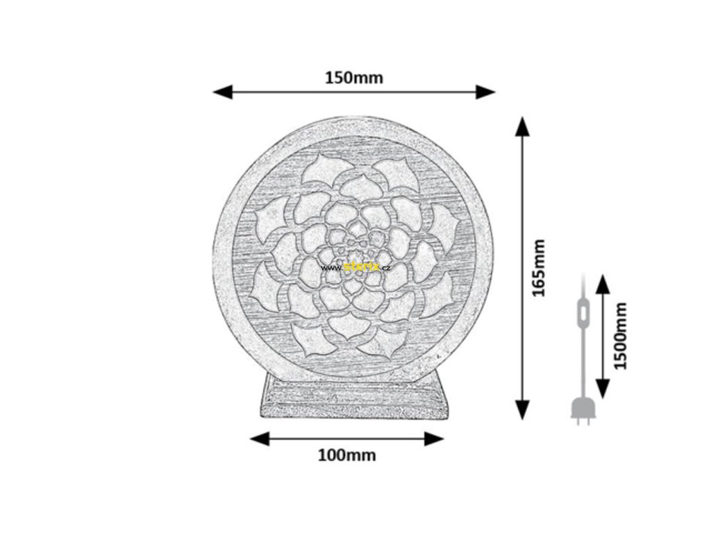 Solná lampa Rabalux Mandali je doporučena těm, kteří mají rádi dekorativní lampy z přírodních materiálů s orientální atmosférou. Tento model je charakteristický svým kulatým tvarem a teplými odstíny, vyrobený je z kamenné soli a dřeva. Díky oranžovo-hnědé barvě a uklidňujícímu designu se může stát výrazným doplňkem vašeho interiéru v ložnici nebo obývacím pokoji. Stolní lampa stojí na stupňovité obdélníkové základně a její konstrukce je zdobena dřevěným prvkem s motivem mandaly. Solnou lampu lze používat s jednou žárovkou s výkonem maximálně 15 W. Patice žárovky je typu E14. Nejlépe se k tomuto modelu hodí žárovka s teplým bílým světlem, která posiluje útulnou a intimní atmosféru. Lampa je dodávána s kabelovým vypínačem a světelným zdrojem.- Rabalux 76031 stolní lampa MANDALI, styl mediteránní