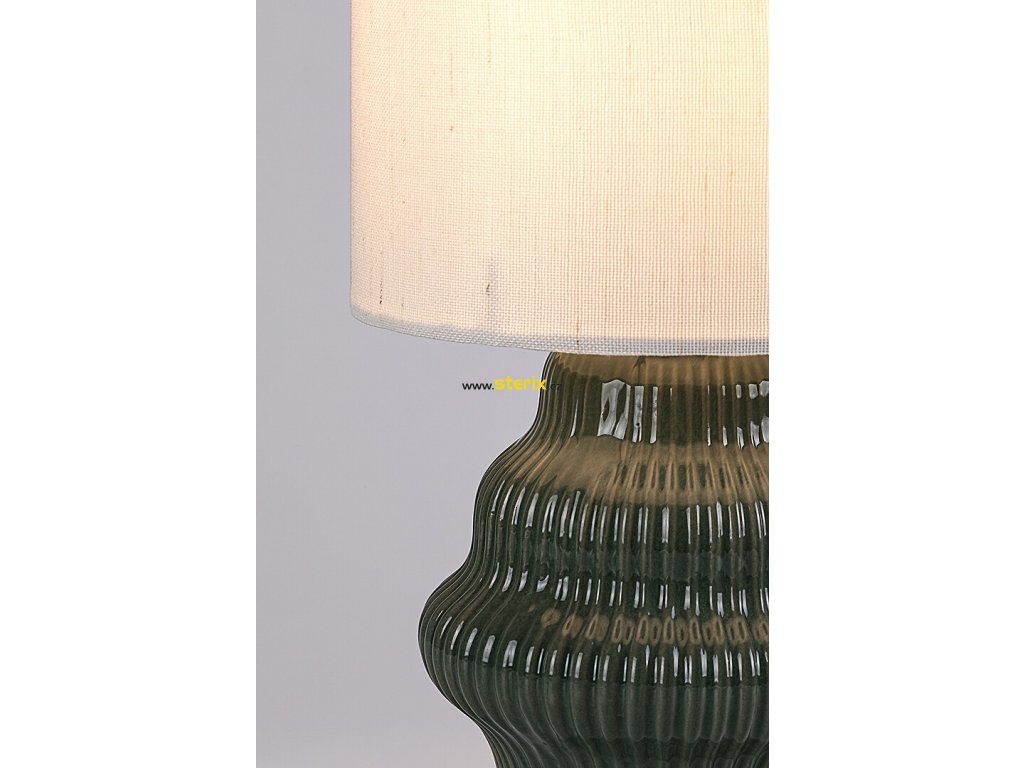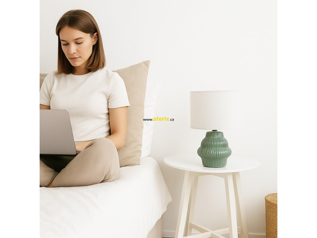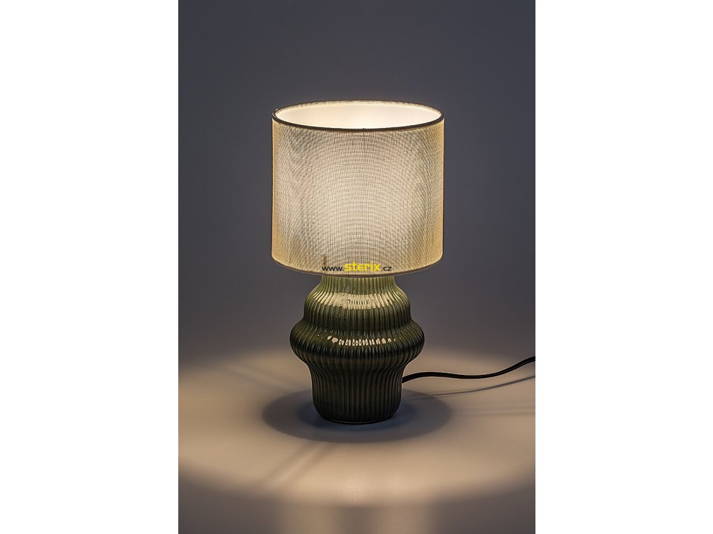 Stolní lampa Rabalux Glimo je ideální pro ty, kteří při výběru svítidla kladou důraz na funkčnost i estetiku. Tento model doporučujeme do ložnice, obývacího pokoje nebo pracovny. Lze jej umístit na stůl, psací stůl nebo noční stolek. Tělo lampy má zajímavý rýhovaný vzor a směrem ke středu se rozšiřuje. Je vyrobeno ze zelené keramiky, zatímco stínidlo je z bílého textilu. Stínidlo má válcový tvar a je otevřené shora i zdola. Díky světlé barvě propouští velké množství světla, takže jej lze použít i jako lampu na čtení. Noční svítidlo funguje s jednou žárovkou s maximálním příkonem 40W. Typ objímky je E14. Lampa je vybavena spínačem na kabelu a dodává se bez světelného zdroje.- Rabalux 74059 stolní lampa GLIMO, styl dekorační