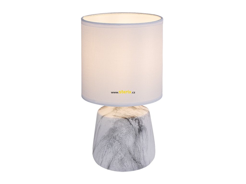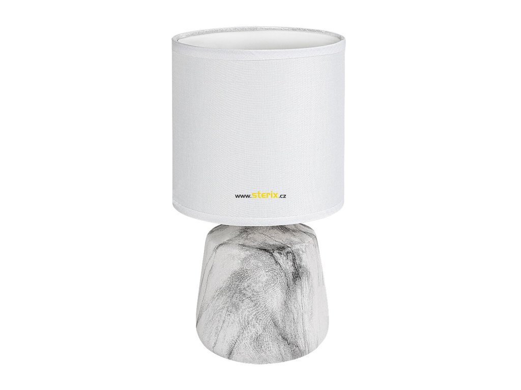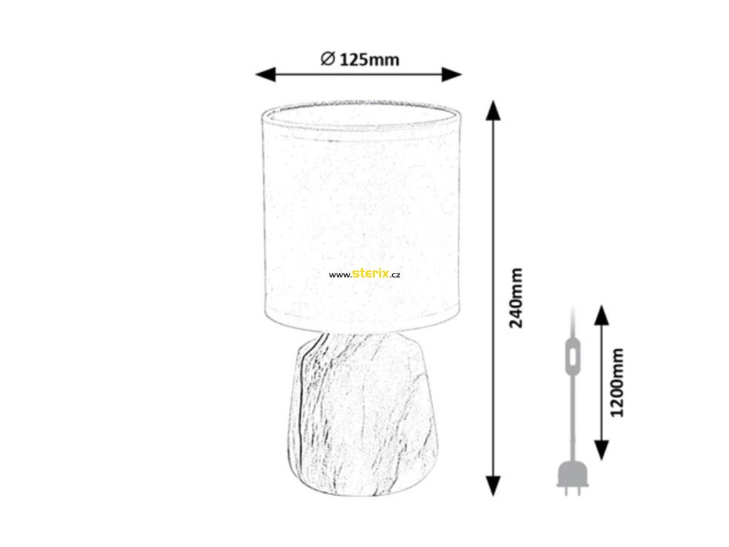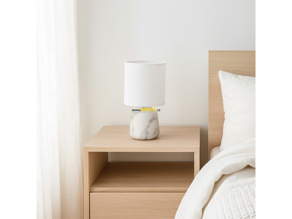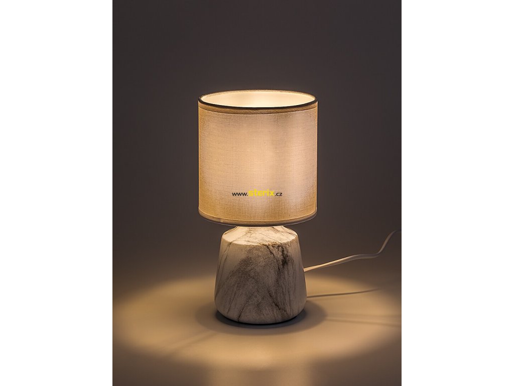 Stolní lampa Rabalux Nalisa je doporučena těm, kteří mají rádi svítidla s přírodním efektem a harmonickým vzhledem. Toto moderní noční světlo má válcovité keramické tělo s šedobílým mramorovým efektem, které doplňuje bílé textilní válcovité stínidlo otevřené shora i zdola. Světlé stínidlo propouští velké množství světla, takže je tato stolní lampa vhodná i na čtení nebo práci. Můžete ji umístit do ložnice nebo obývacího pokoje – na noční stolek či stůl – ale skvěle se hodí i na pracovní stůl v kanceláři. Lampa funguje s jednou žárovkou s maximálním příkonem 40 W. Typ objímky je E14. Keramická noční lampa je vybavena bílým kabelem a spínačem na kabelu. Dodává se bez světelného zdroje.- Rabalux 74067 stolní lampa NALISA, styl moderní