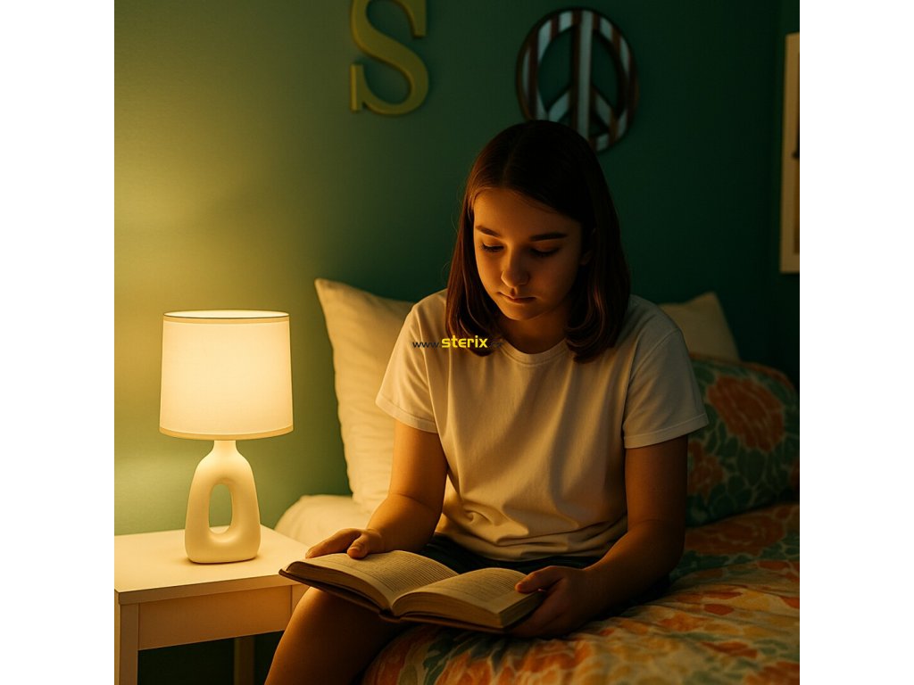 Stolní lampa Rabalux Sylira je doporučena těm, kteří hledají doplňkové svítidlo s jedinečným designem do obývacího pokoje nebo ložnice. Toto moderní noční světlo se vyznačuje keramickým tělem s otvorem uprostřed, vyrobeným z bílé keramiky. Stínidlo je válcovitého tvaru, otevřené shora i zdola, a je vyrobeno z bílého textilu. Stolní lampu lze používat s jednou žárovkou s maximálním příkonem 40 W. Typ objímky je E14. Podle vlastního vkusu si můžete zvolit světelný zdroj s teplým nebo přirozeným bílým světlem. Pokud lampu umístíte do ložnice, doporučuje se použít žárovku s teplým bílým světlem, která napomáhá vytvořit relaxační atmosféru. Lze ji umístit na noční stolek nebo na jakýkoli stůl. Noční svítidlo se ovládá pomocí spínače na kabelu. Dodává se bez světelného zdroje.- Rabalux 74070 stolní lampa SYLIRA, styl moderní