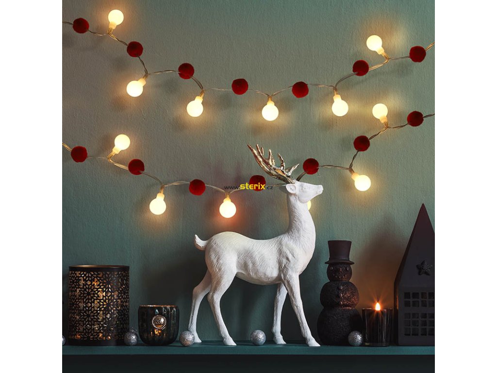 Řetízek obsahuje 20 červených koulí doplněných 20 LED diodami, které vyzařují příjemné teplé bílé světlo. Ovládání je jednoduché pomocí režimů zapnuto/vypnuto. Díky napájení na dvě AA baterie (nejsou součástí balení) lze dekoraci snadno umístit kamkoli bez nutnosti elektrické zásuvky.