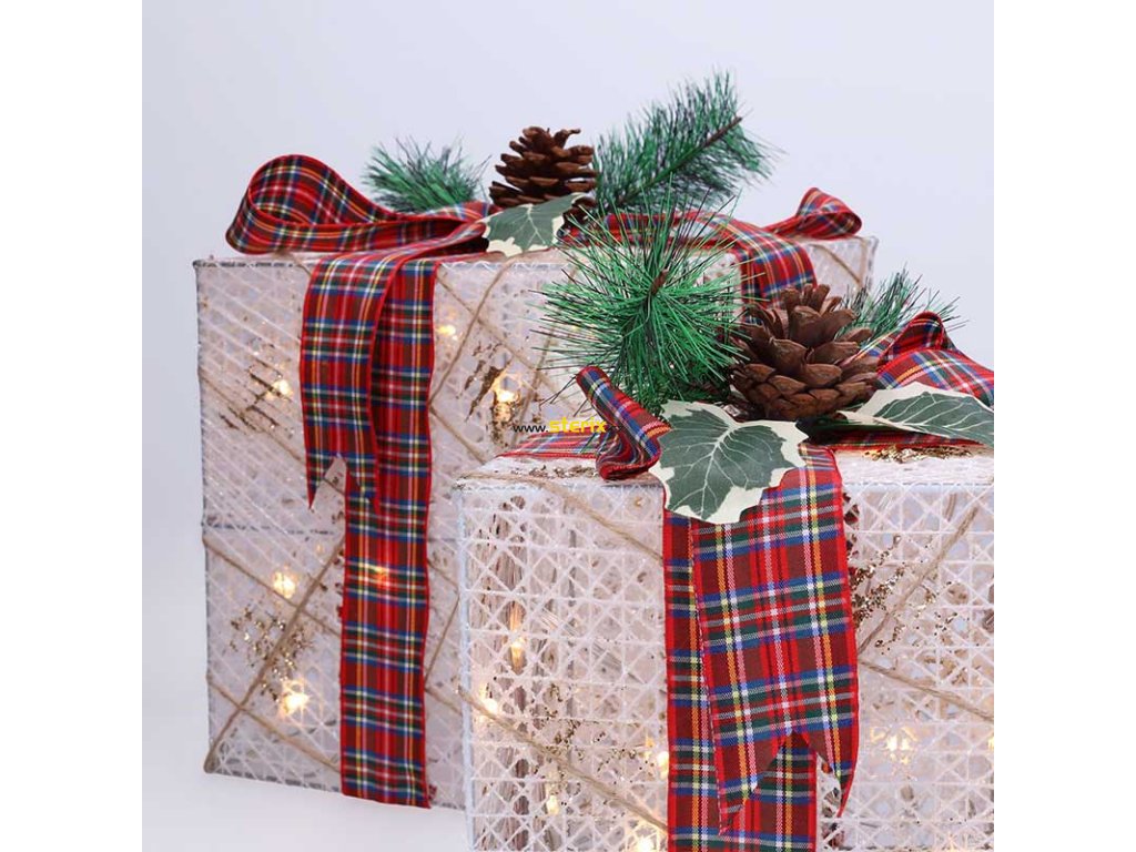 Sada obsahuje tři dárky různých velikostí (20 cm, 15 cm a 12 cm), které jsou osvětleny 48 LED diodami v teplé bílé barvě. Díky praktickému časovači se světla automaticky zapnou na 6 hodin a poté se na 18 hodin vypnou, což zajišťuje pohodlné a energeticky úsporné používání.