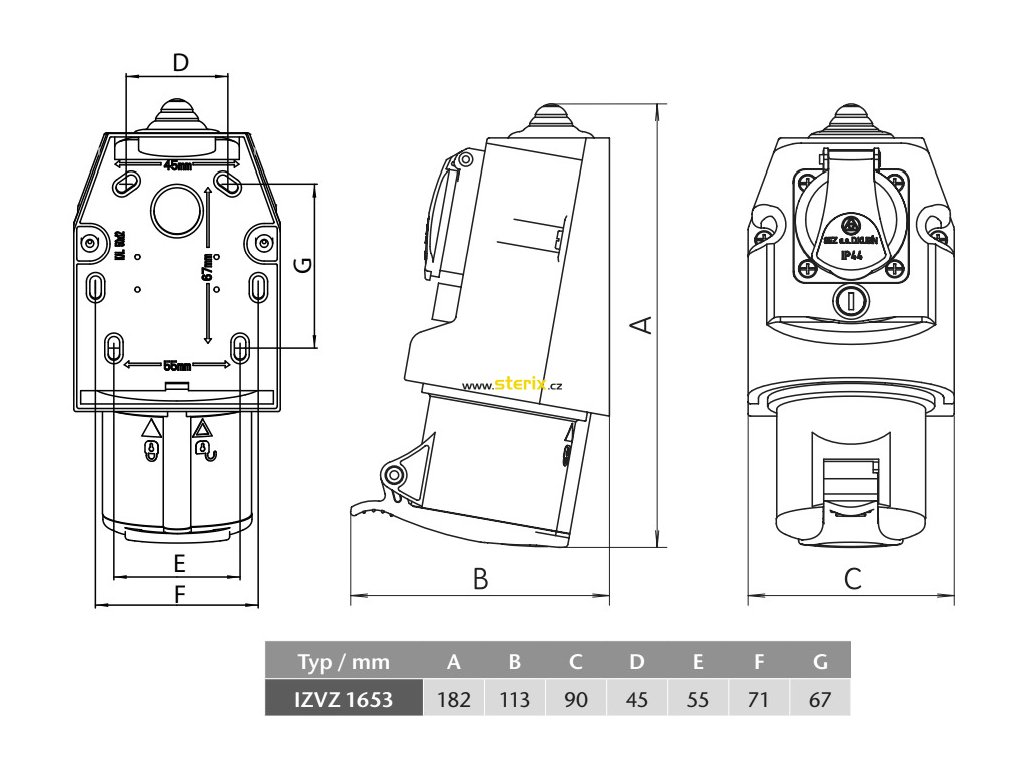 Průmyslová kombinovaná nástěnná zásuvka IZVZ 1653 je 5-pólová zásuvka na omítku pro jmenovité napětí 400V s proudem 16A a krytím IP 44 se zásuvkou 230V.