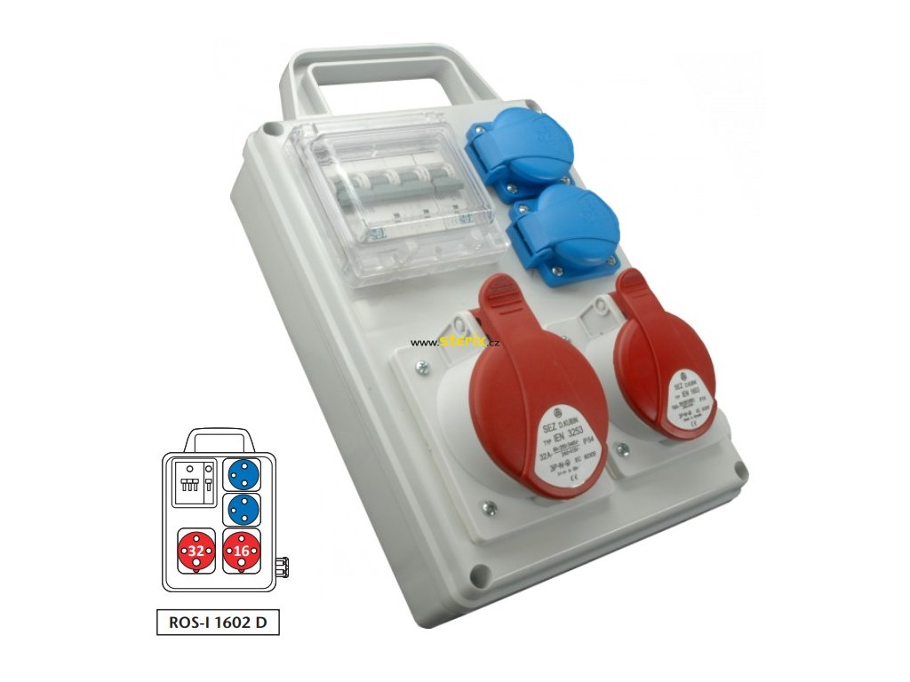 na staveništích, průmyslových rozvodech, apod. - Zásuvková rozvodnice 1x3243+1x1643+2x230 V s držákem, jištěná, IP 44 SEZ-CZ ROS-I 1602 D