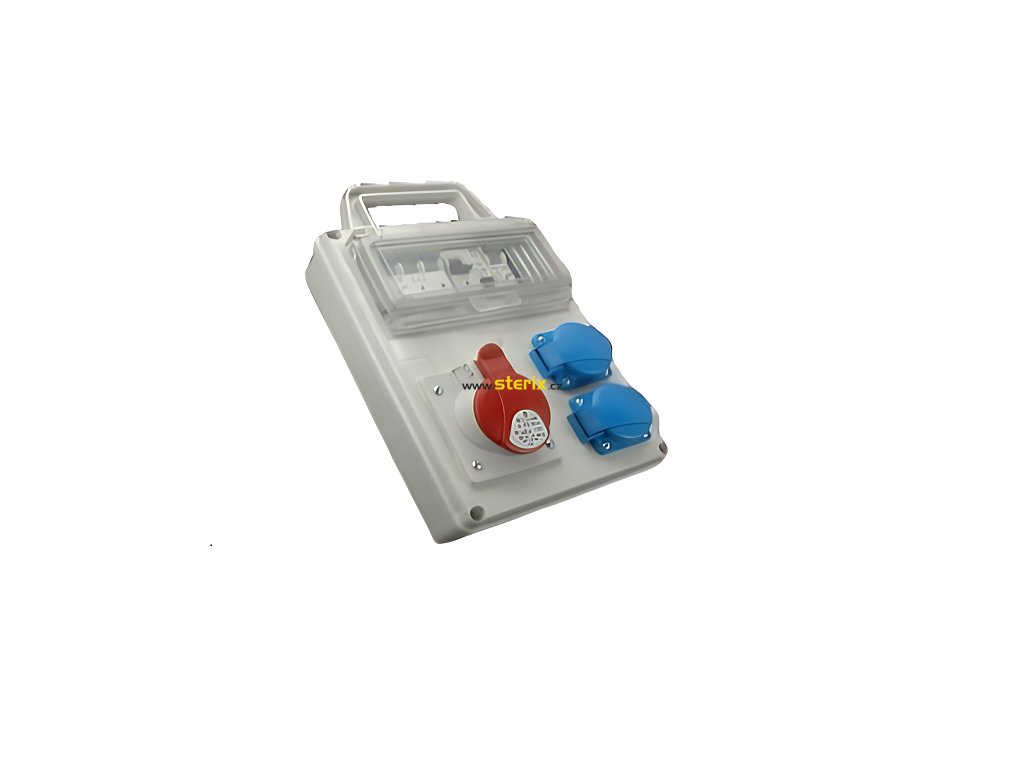 na staveništích, průmyslových rozvodech, apod. - Zásuvková rozvodnice 1x3253+2x230 V s držákem, IP 44, 8 modulové okénko SEZ-CZ ROS X8-3203 D