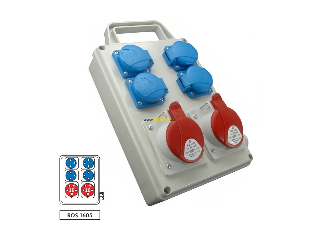 Zásuvková mini rozvodnice nejištěná ROS 1605 s držákem se 2 zásuvkami 1653 (5-pól) 16 A pro 400V a 4 zásuvkami 230 V s krytím IP 44 pro připojení třífázových i jednofázových elektrických spotřebičů.