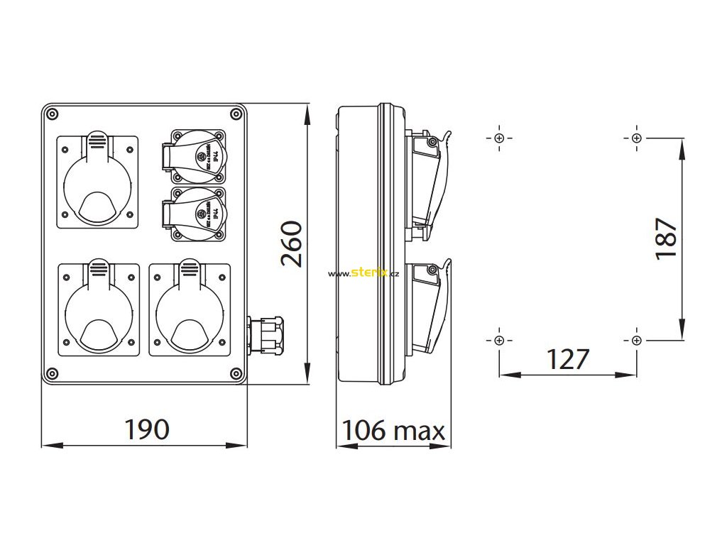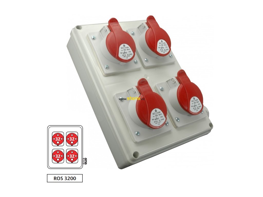 Zásuvková mini rozvodnice nejištěná ROS 3200 se 4 zásuvkami 3243 (4-pól) 32 A pro 400V s krytím IP 44 pro připojení třífázových i jednofázových elektrických spotřebičů.