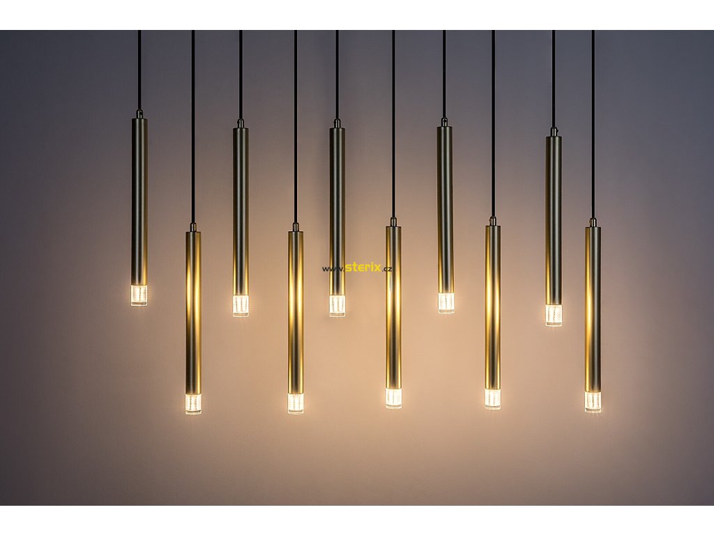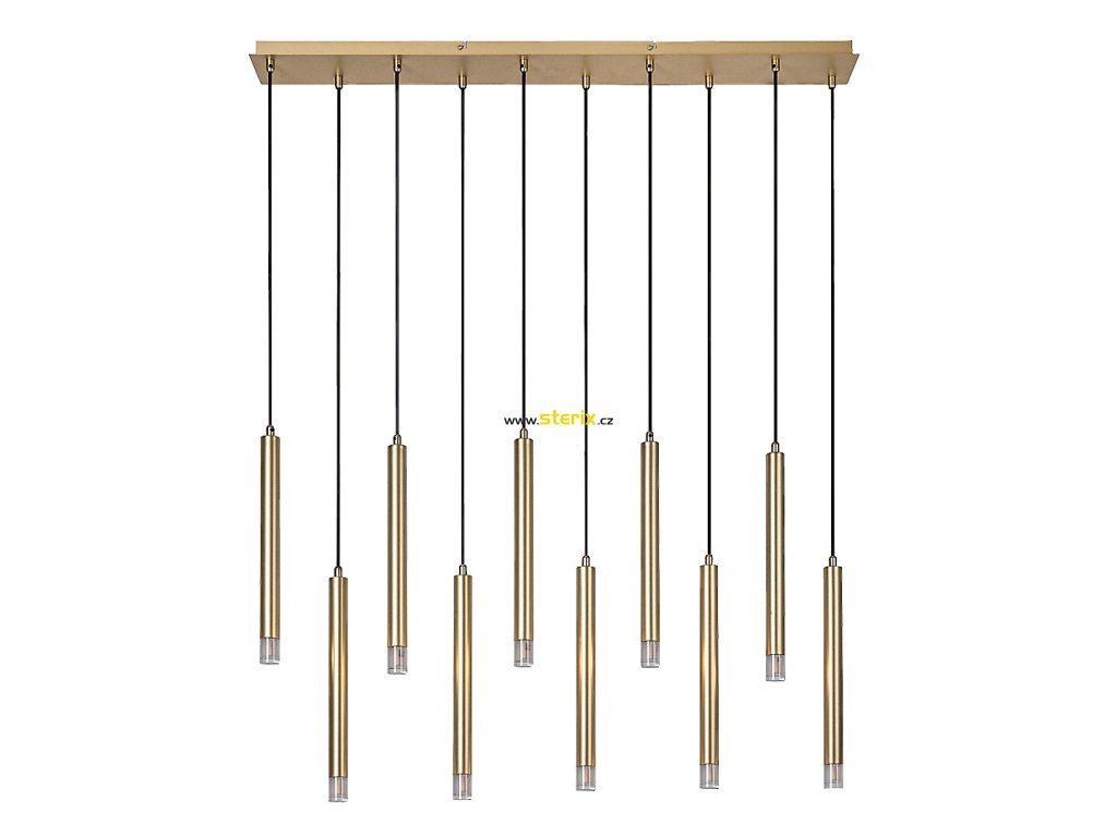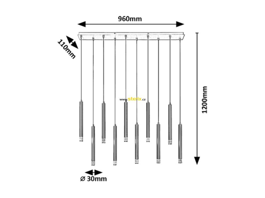Závěsné svítidlo Rabalux Ramira s deseti žárovkami je primárně doporučeno těm, kteří hledají závěsné svítidlo v minimalistickém stylu, ale zároveň s působivými rozměry a vysokou světelnou intenzitou. Svítidlo je vyrobeno z kovu v elegantní zlaté barvě a doplněno průhlednými akrylovými stínidly a dlouhou čtvercovou dekorativní základnou ve stejné barvě jako světelné prvky. Světelné prvky mají malý průměr, trubicovitý, válcový tvar a jsou uspořádány vedle sebe v jedné řadě. Jsou zavěšeny v různých výškách, což tomuto modelu dodává jedinečný vzhled. Závěsné svítidlo je ideální nejen do obývacího pokoje, ale také do kuchyně, jídelny nebo ložnice. Lze jej použít s deseti žárovkami, každou o výkonu až 5 W. Typ objímky je G9. Svítidlo se dodává bez světelných zdrojů.