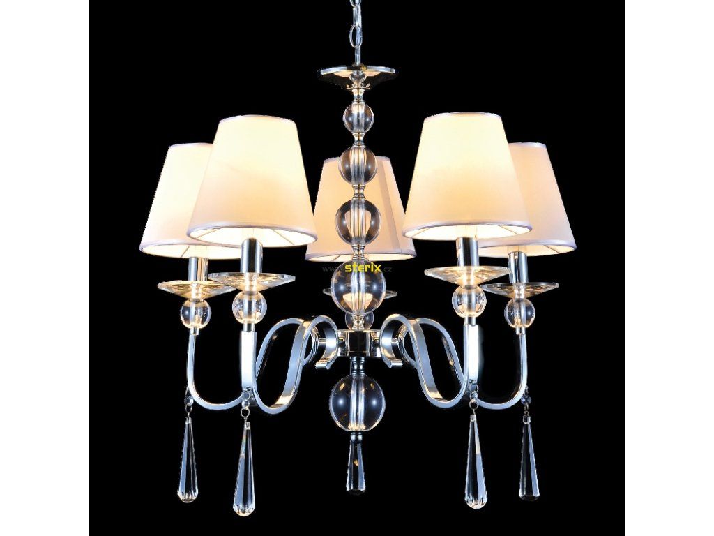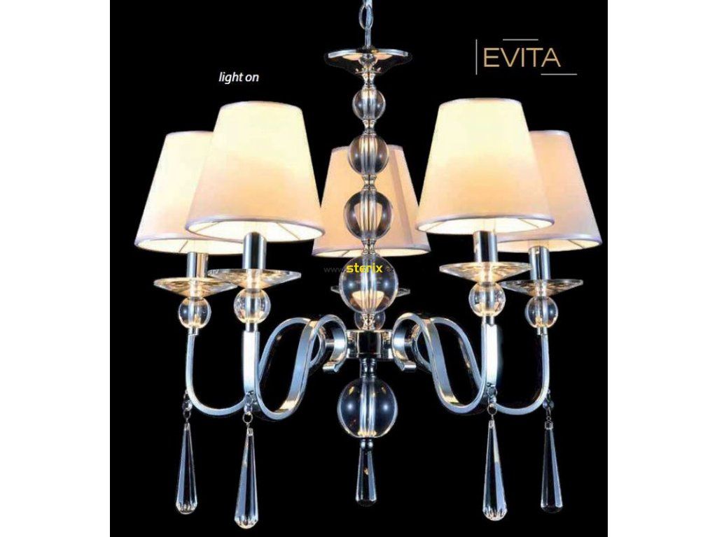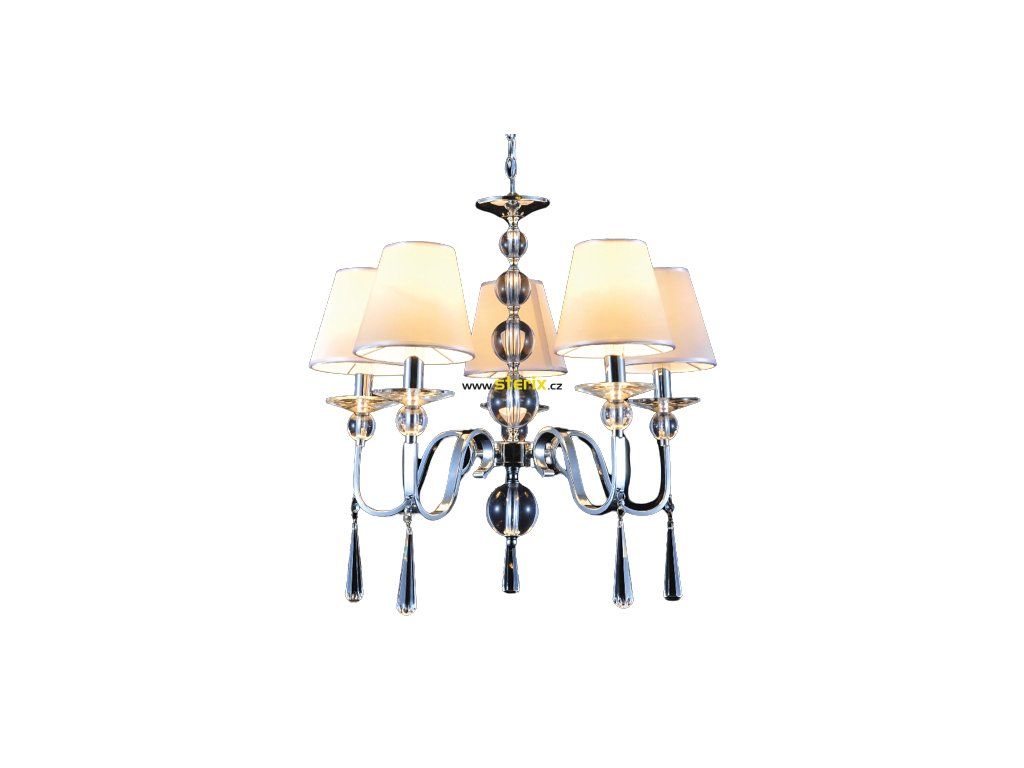 Závěsný lustr EVITA, průměr 58cm, materiál kov+tkanina+křišťálové sklo, barva stříbrná perla+chromu a čirá, příkon klasického světelného zdroje max. 5x40W, 5x objímka pro patici E14, IP20.
